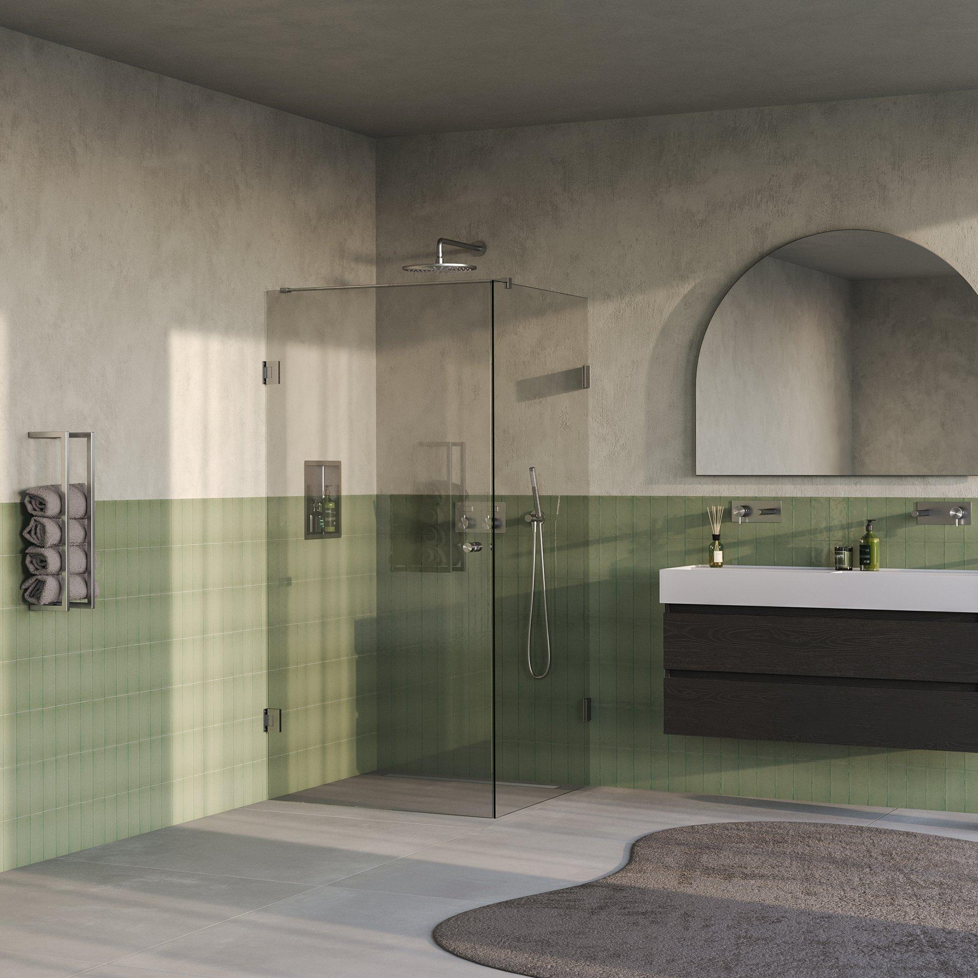 Cette cabine est un exemple d'élégance moderne. Le verre clair crée une atmosphère ouverte et lumineuse, tandis que l'acier inoxydable brossé avec revêtement PVD offre une apparence subtile et luxueuse qui s'harmonise parfaitement avec divers styles de salle de bains. Les lignes épurées et le design minimaliste en font un choix intemporel qui se combine aisément avec d'autres éléments de votre salle de bains. Grâce aux matériaux de haute qualité, la cabine conserve son bel aspect même après des années d'utilisation. Vous ajoutez ainsi non seulement un élément fonctionnel, mais aussi un véritable point fort qui complète votre salle de bains.