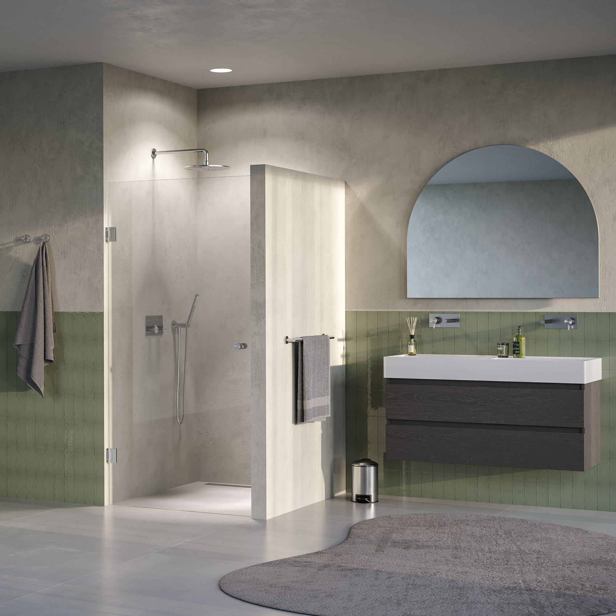 Cette porte de niche est un exemple d’élégance intemporelle. Le verre clair combiné au cadre en acier inoxydable brossé avec revêtement PVD donne à votre salle de bains une apparence raffinée et moderne. Le design minimaliste s’intègre sans effort dans divers styles d’intérieur, du contemporain épuré au chaleureux et naturel. Grâce au verre transparent, l’espace reste ouvert et lumineux, créant une sensation de luxe et de calme. Ainsi, vous bénéficiez non seulement d’une solution pratique, mais aussi d’une prouesse esthétique qui complète votre salle de bains.