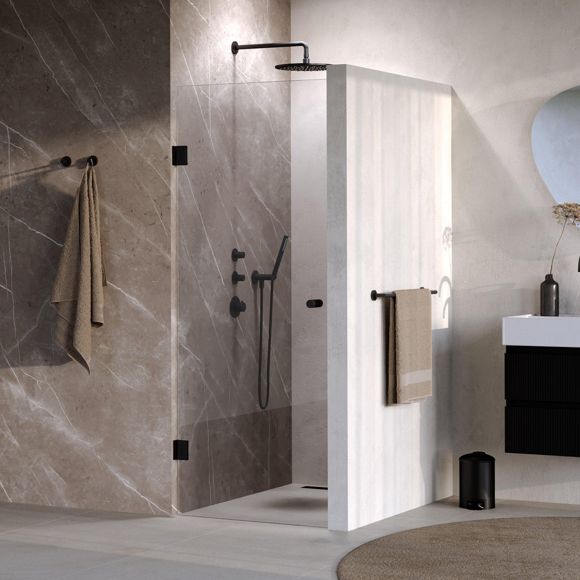 Cette porte de niche se distingue immédiatement par son design moderne et minimaliste. Le verre clair offre une apparence ouverte et lumineuse, tandis que la quincaillerie noir mat ajoute une touche robuste et contemporaine. Cette combinaison fait de la porte un véritable élément remarquable dans votre salle de bains. Grâce aux lignes épurées et à la finition de haute qualité, l'ensemble dégage luxe et raffinement. Vous offrez ainsi à votre salle de bains une mise à niveau élégante qui dure des années et ne se démode jamais.