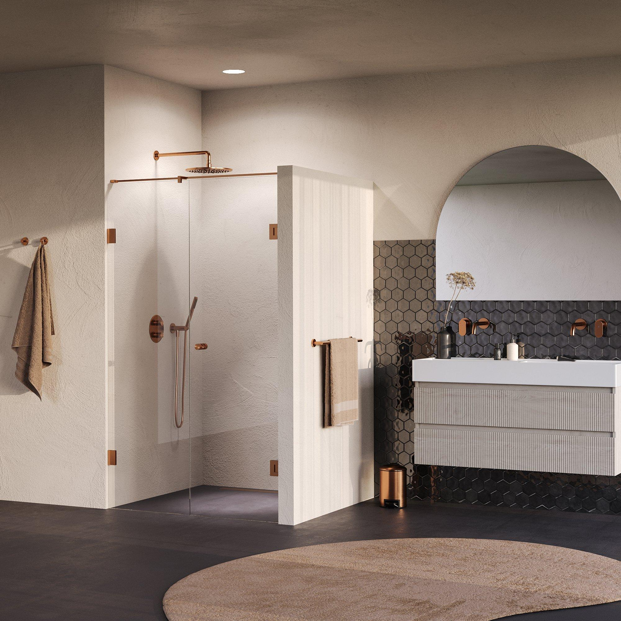 La porte de niche est un exemple d'élégance raffinée. Le verre clair crée une atmosphère ouverte et lumineuse, tandis que le cuivre brossé ajoute une touche chaude et exclusive qui élève immédiatement votre salle de bains à un niveau supérieur. Cette finition de couleur unique est non seulement tendance, mais aussi intemporelle, vous garantissant un aspect stylé qui dure des années. Grâce à la brillance subtile du cuivre, une combinaison harmonieuse se crée avec divers styles de salle de bains, du moderne au classique. Ainsi, vous créez une salle de bains qui est non seulement fonctionnelle, mais aussi un lieu où vous aimez passer du temps chaque jour.