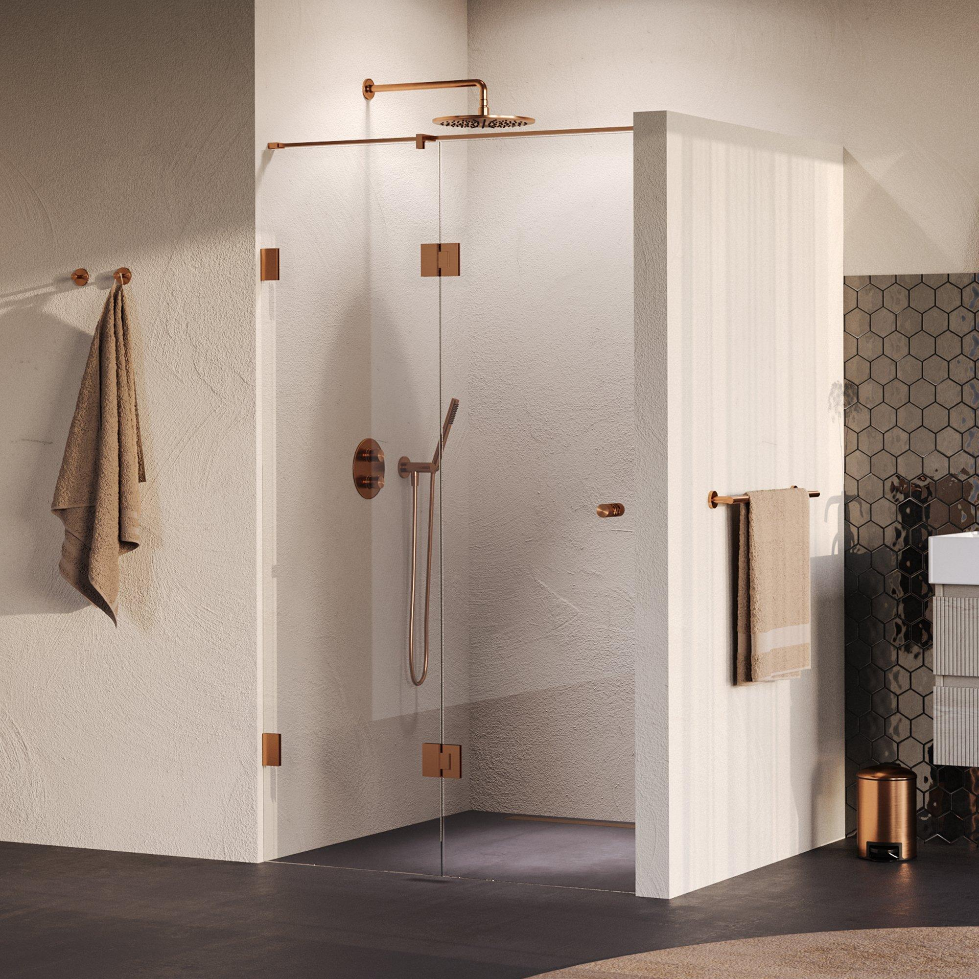 Cette porte de niche se distingue immédiatement par son design raffiné et l’aspect chaleureux du cuivre brossé. Le revêtement PVD assure non seulement une finition magnifique et durable, mais protège également contre la décoloration et l’usure. Le verre clair crée un effet d’espace et laisse passer la lumière librement, rendant votre salle de bains plus grande et plus lumineuse. Grâce aux détails subtils et aux matériaux de haute qualité, vous ajoutez une élégance intemporelle qui s’harmonise facilement avec différents styles d’intérieur. Vous créez ainsi une salle de bains qui est non seulement fonctionnelle, mais aussi un véritable point focal.