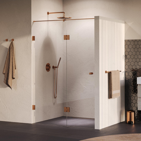 Cette porte de niche est un exemple de style raffiné. Le verre clair crée une ambiance ouverte et lumineuse, tandis que la finition cuivre brossé PVD ajoute une touche chaude et moderne. Cette combinaison en fait un choix parfait pour ceux qui veulent donner à leur salle de bains un aspect contemporain et luxueux. La conception sans profil contribue à un look épuré et minimaliste, permettant à la porte de s’intégrer sans effort dans tout intérieur de salle de bains. Vous créez ainsi un design intemporel qui ne se démode pas rapidement et dont vous profiterez pendant des années.