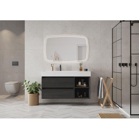 LuxeLe Miroir Rock de HR Badmeubelen dégage une pure luxe. Son design mince et sa finition de haute qualité offrent une apparence élégante qui élève votre salle de bain à un niveau supérieur. L'éclairage LED dimmable crée l'ambiance parfaite à tout moment de la journée, tandis que le chauffage intégré empêche le miroir de s'embuer, vous garantissant toujours une vue claire. Ce miroir ajoute non seulement du style à votre salle de bain, mais offre également un confort et une commodité ultimes.