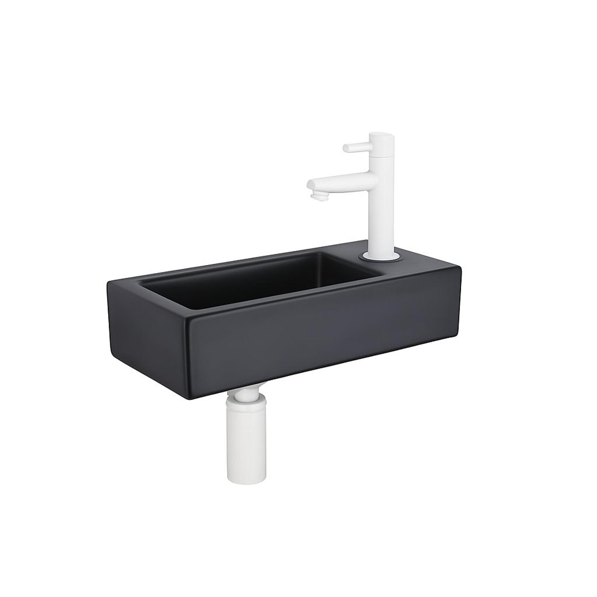 QeramiQ Fuente Ensemble lave-mains - 37.5x18.5x9cm - céramique - trou de robinet à droite - robinet de lave-mains blanc mat - bouchon de vidage - siphon bas - Noir mat