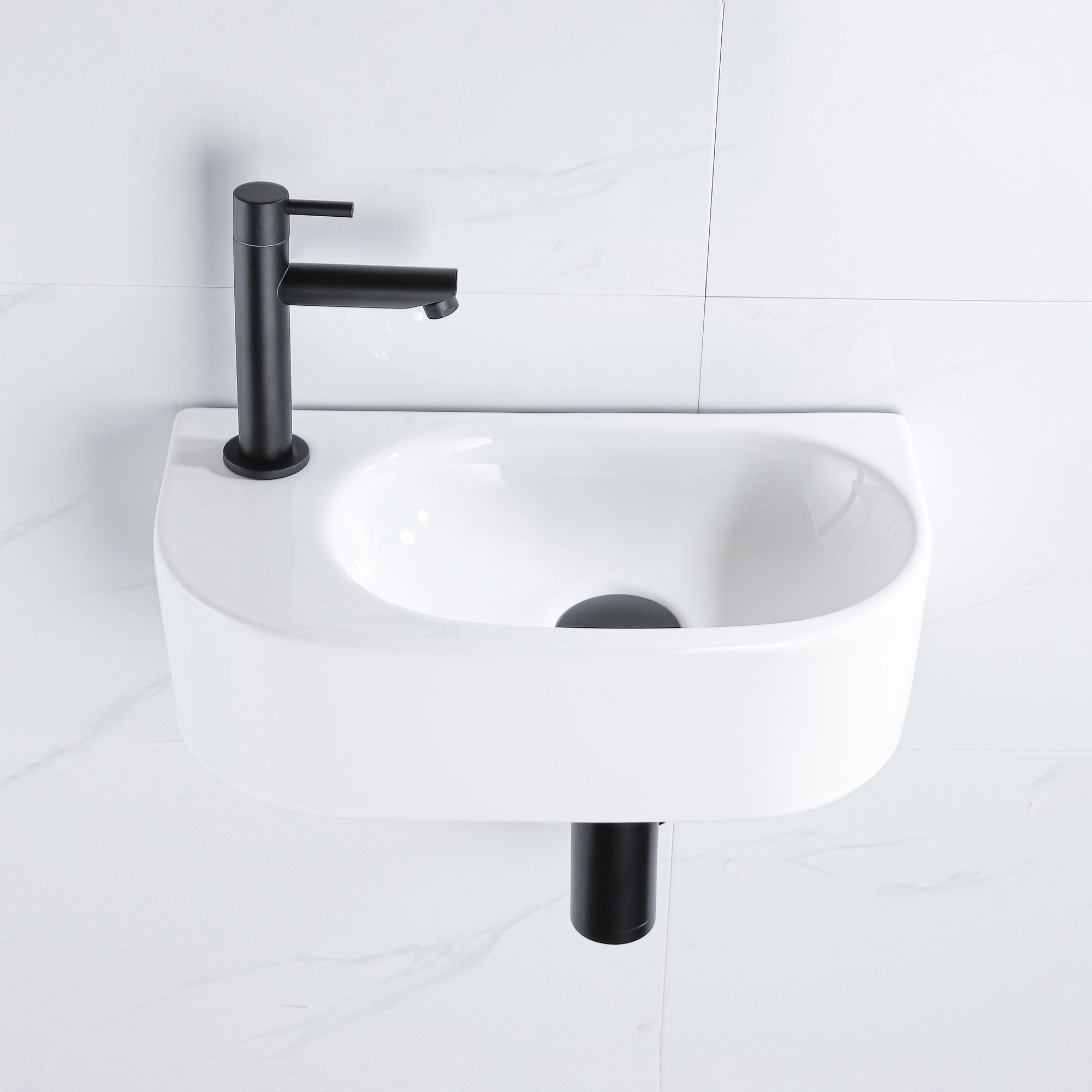 QeramiQ Fuente set de fontaine - 40x21,5x12 cm - gauche - lisse - semi-circulaire - 1 trou pour robinet - céramique - robinet de fontaine blanc mat - bouchon de vidange - siphon abaissé - blanc brillant