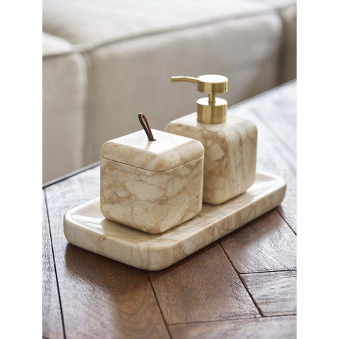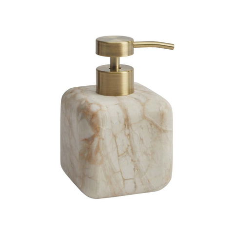 Le distributeur de savon Aquanova Blake en couleur Desert-118 est un ajout luxueux et fonctionnel à votre salle de bains ou cuisine. Ce distributeur fait main de la série Blake présente la forme caractéristique de cube arrondi avec des dimensions de 8 x 8 cm et une hauteur de 13 cm. La pierre naturelle beige, enrichie d'une douce marbrure brun clair, confère au distributeur une apparence raffinée, digne d'un spa.Le distributeur de savon a une capacité de 150 ml et est équipé d'une pompe en acier inoxydable couleur laiton, assurant une finition élégante et durable. La couleur neutre Desert se combine aisément avec des teintes chaudes comme froides et s'harmonise parfaitement avec d'autres accessoires de la série Blake pour un ensemble cohérent.