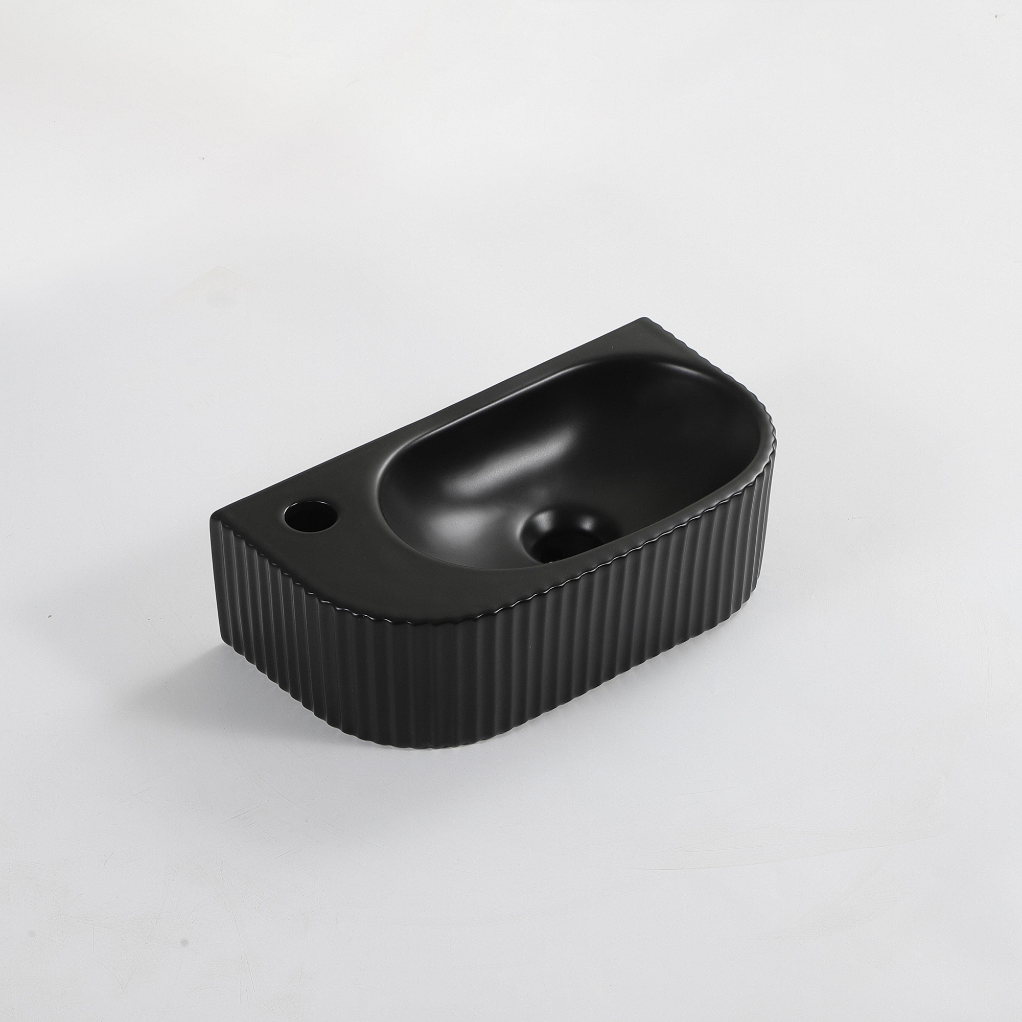 Avec sa forme demi-ronde striée et sa finition noire mate, ce lave-mains dégage élégance et classe. Le design subtil ajoute une touche de luxe à chaque salle de bain, tandis que le trou de robinet permet un accès facile à l'eau. Ce lave-mains est une parfaite combinaison de style et de fonctionnalité, en faisant un point focal dans votre salle de bain.