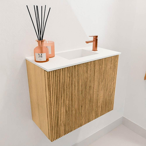 Avec ce magnifique meuble, vous donnez immédiatement à votre salle de bains une ambiance chaleureuse et naturelle. Le format compact le rend idéal pour les petits espaces, tandis que la combinaison de chêne massif et de placage chêne assure une atmosphère intemporelle et de haute qualité. La structure subtile en relief sur les façades ajoute un détail ludique et contemporain, faisant du meuble non seulement un élément fonctionnel, mais aussi un véritable point focal. La vasque, réalisée dans une douce couleur talc et avec un trou de robinet sur le côté droit, s'intègre parfaitement au meuble et vous offre beaucoup d'espace pour effectuer confortablement vos routines quotidiennes. Grâce à la fixation murale, l'espace paraît aéré et facile à nettoyer, ce qui contribue à une salle de bains fraîche et soignée. Ce meuble élève votre salle de bains à un niveau supérieur, où style et praticité vont de pair.