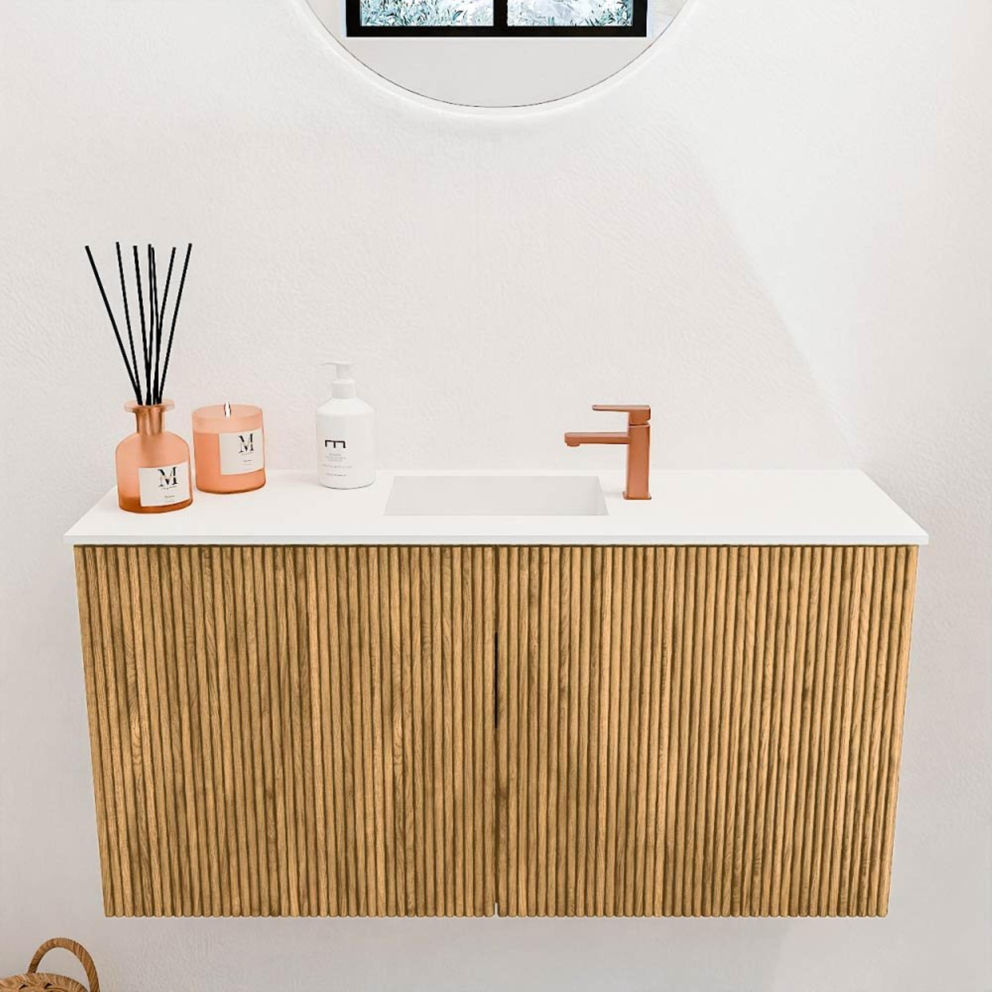 La combinaison de chêne massif à l'avant avec du placage sur les côtés assure une apparence haut de gamme et authentique. Ce meuble dégage une élégance naturelle et s'adapte sans effort à divers styles de salle de bains. La couleur chaude du chêne apporte calme et ambiance, tandis que les lignes épurées offrent une touche moderne. La vasque subtile de couleur talc crée un beau contraste qui donne encore plus de caractère à l'ensemble. Vous profitez ainsi d'un meuble qui est non seulement pratique, mais aussi un véritable accroche-regard dans votre salle de bains.