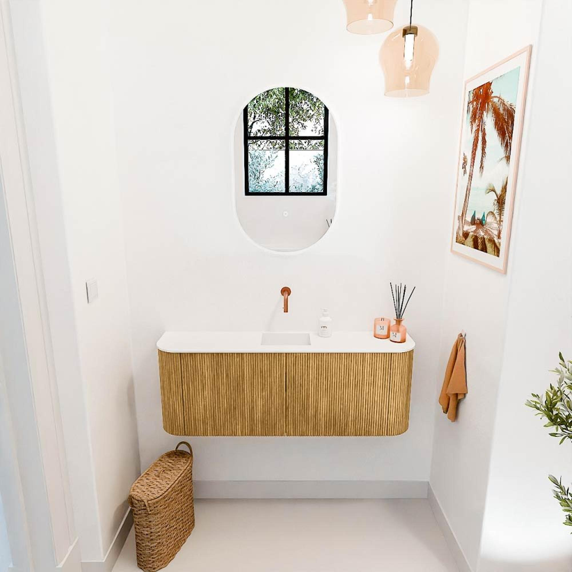 Mondiaz JOYA 113.2cm meuble de salle de bains - arrondi gauche et droite couleur Chêne - Vasque FAYE position Milieu Sans trou de robinet couleur Talc.