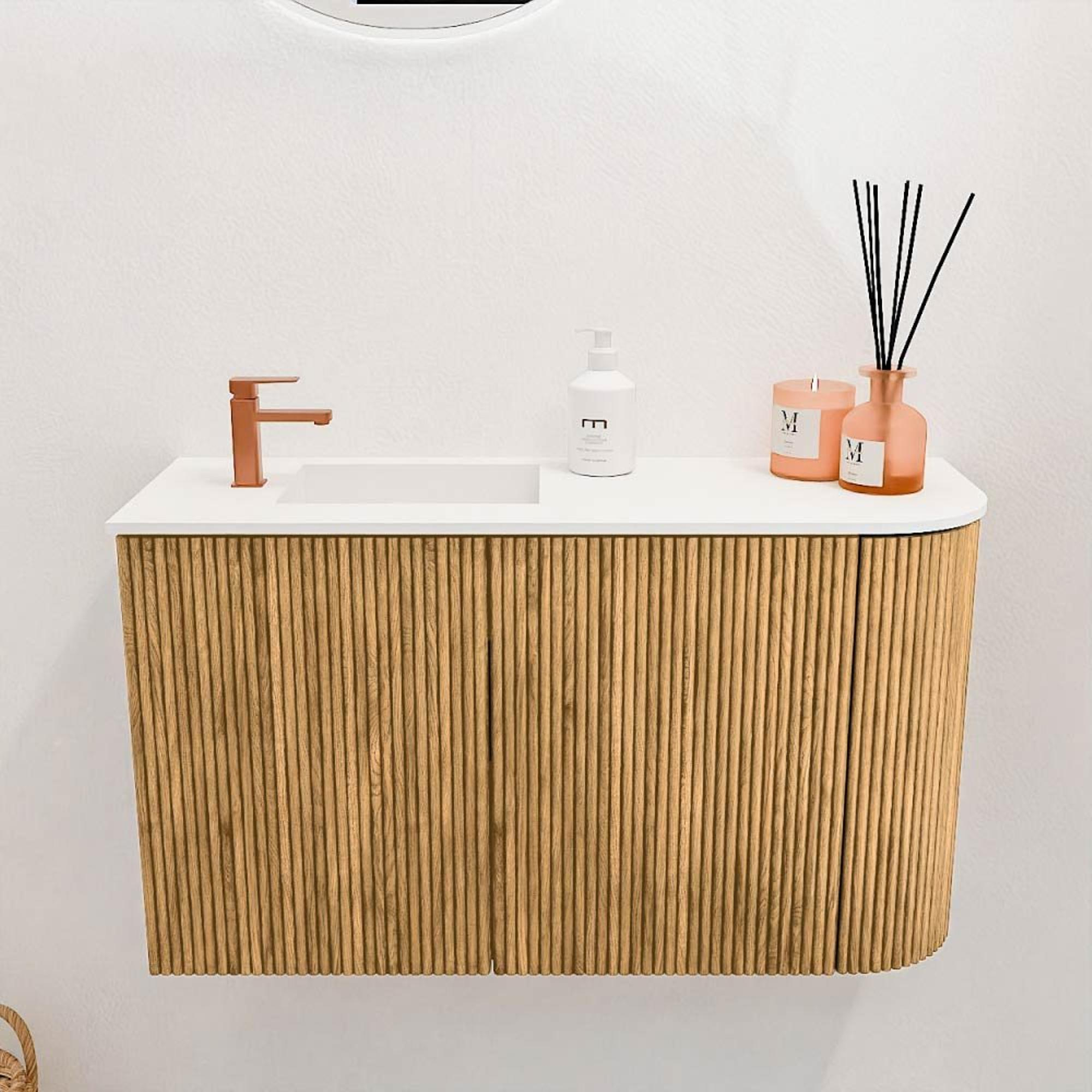La couleur chaude Chêne du meuble donne à votre salle de bains une apparence naturelle et intemporelle. L'arrondi subtil sur le côté droit rend le design unique et moderne, ce qui permet au meuble de s'intégrer sans effort dans différents styles d'intérieur. La vasque de couleur Talc ajoute un élément frais et clair, assurant un équilibre harmonieux entre chaleur et luminosité. Ce meuble n'est pas simplement un élément fonctionnel, mais un véritable point focal qui donne une touche personnelle à votre salle de bains. Ainsi, vous profitez chaque jour d'un environnement élégant qui dégage calme et élégance.