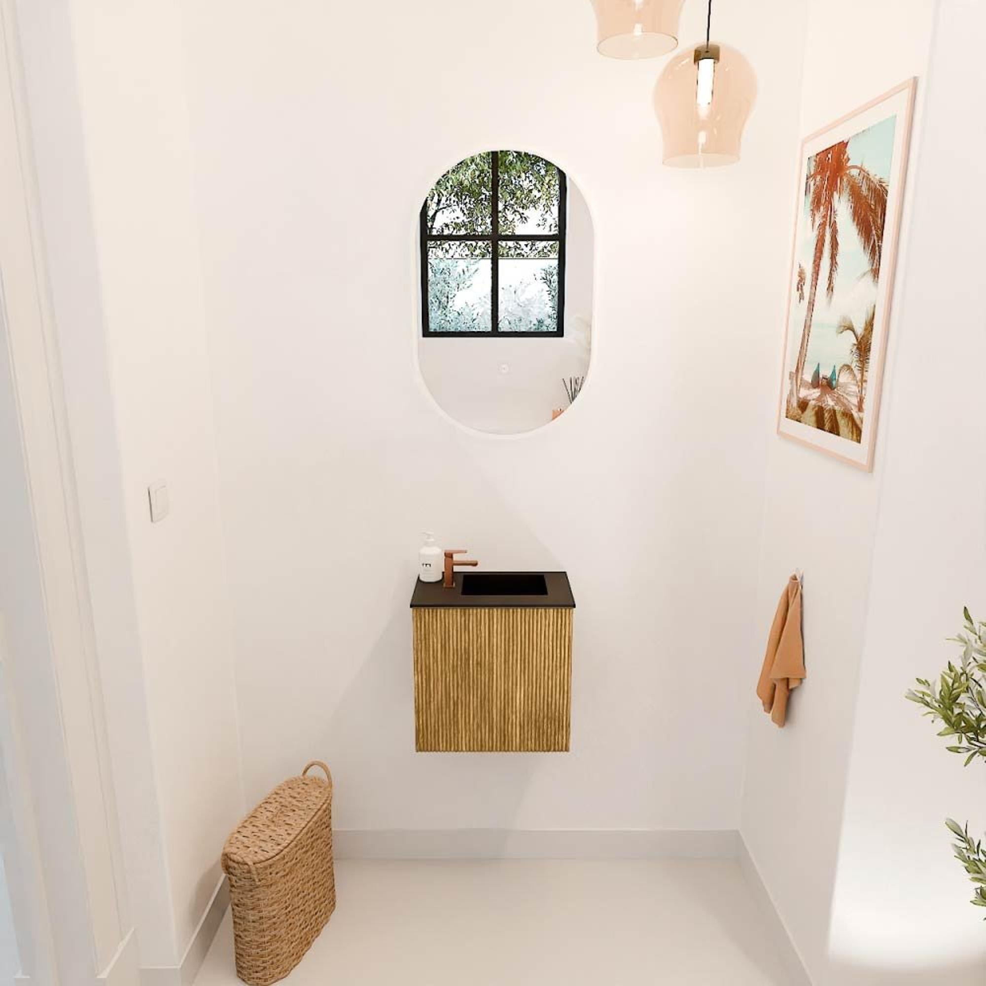 La finition en chêne naturel avec une teinte urban donne au meuble une apparence chaleureuse et contemporaine. Cela en fait non seulement un élément fonctionnel, mais aussi un véritable point focal dans votre salle de bains. La structure rainurée sur les façades ajoute un détail subtil mais distinctif, ce qui confère au meuble une ambiance luxueuse et raffinée. Ainsi, vous profitez d'une salle de bains qui n'est pas seulement pratique, mais aussi élégante et accueillante.
