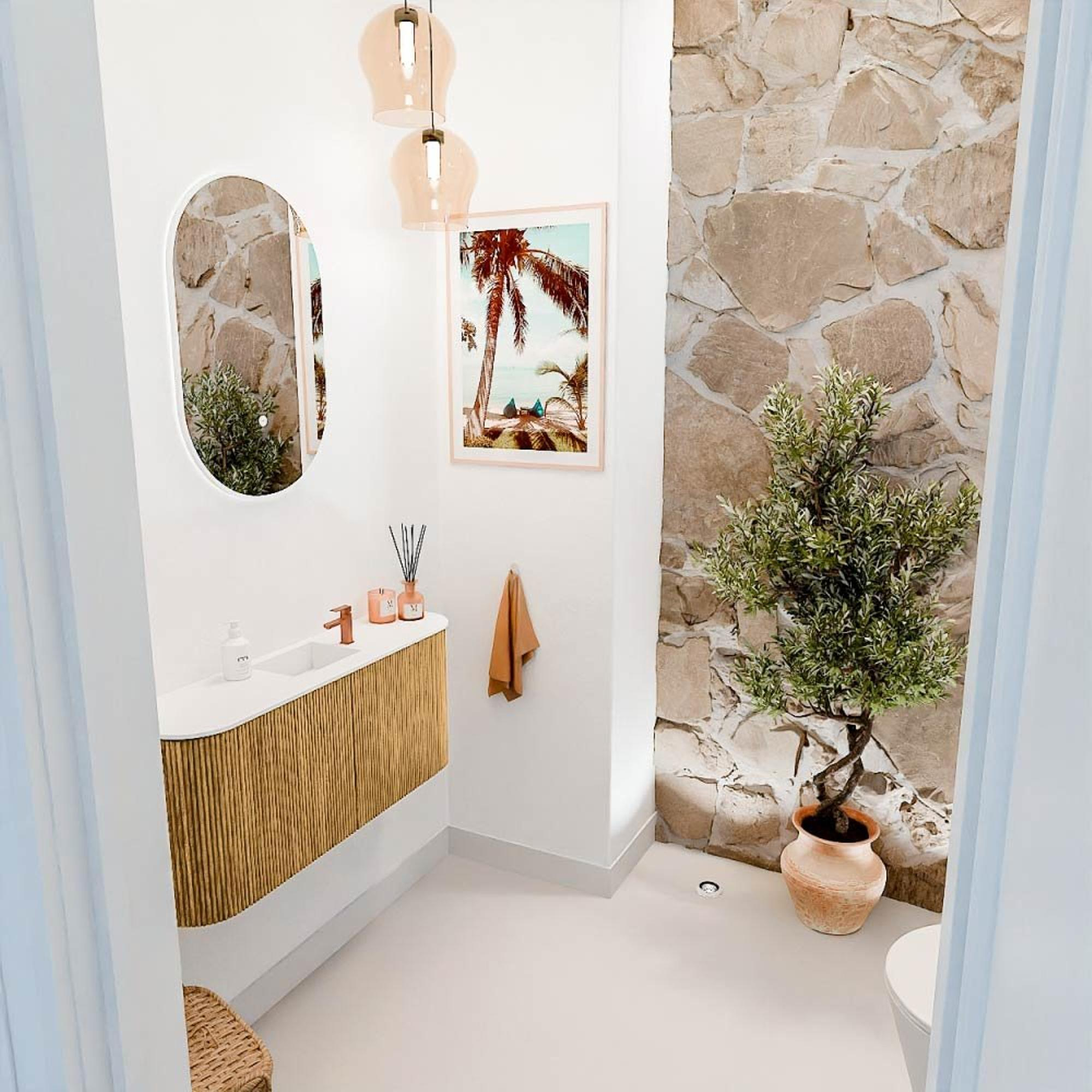 Avec ce magnifique meuble, vous donnez immédiatement à votre salle de bains une apparence élégante et chaleureuse. La combinaison du bois de couleur Chêne naturel avec le lavabo doux couleur Talc crée un ensemble harmonieux qui respire le calme et l'élégance. Grâce aux arrondis astucieux à la fois sur le côté gauche et droit, le meuble ne paraît pas seulement accueillant, mais s'intègre également parfaitement dans diverses configurations de salle de bains. Le lavabo avec un trou de robinet central permet d'installer facilement un robinet de votre choix, afin de personnaliser entièrement votre salle de bains. Ce meuble n'est pas seulement un élément fonctionnel