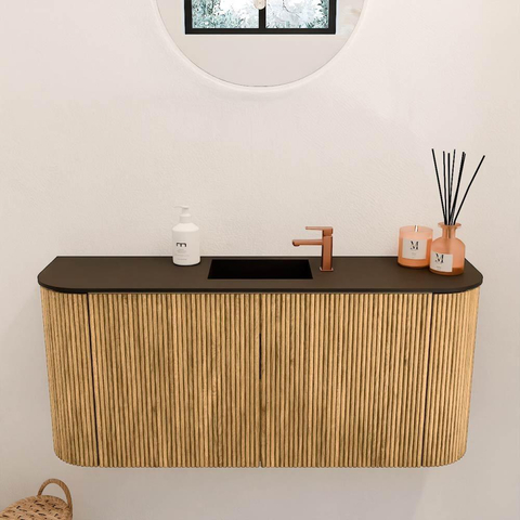 Le meuble attire immédiatement l’attention par son design élégant avec des arrondis doux à gauche et à droite. La couleur chaude chêne crée une atmosphère naturelle et apaisante, parfaite pour une salle de bains moderne. La structure nervurée sur les panneaux avant ajoute un détail subtil qui donne du caractère et de la profondeur au meuble. Ainsi, vous créez une salle de bains qui n’est pas seulement fonctionnelle, mais aussi un véritable élément décoratif. Grâce au design intemporel, le meuble s’adapte facilement à différents styles d’intérieur, du moderne épuré au chaleureux campagne.