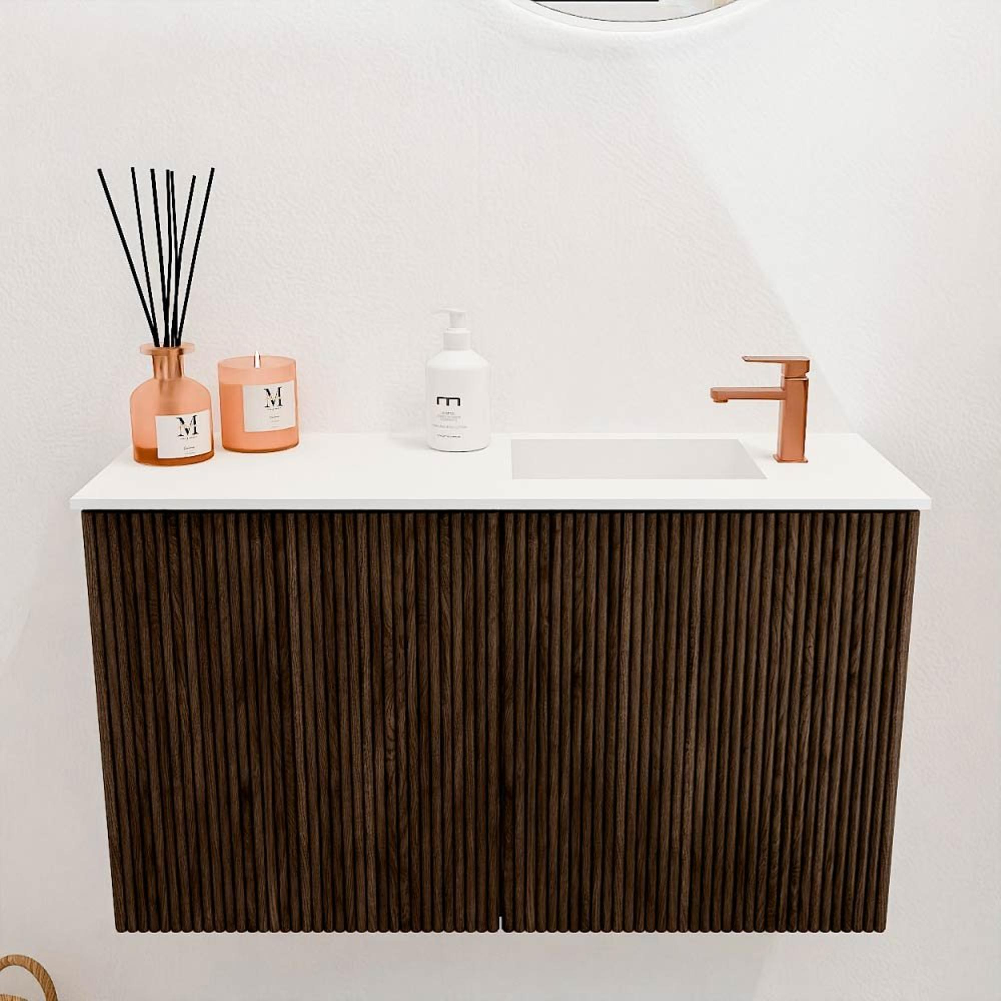 Les rainures verticales sur les façades donnent au meuble un aspect moderne et chic qui s'harmonise facilement avec différents styles d'intérieur. La couleur chaude noyer crée une atmosphère naturelle et accueillante, rendant votre salle de bains immédiatement plus conviviale. Grâce à un design réfléchi, vous combinez esthétique et éléments pratiques, ce qui donne à votre salle de bains une allure luxueuse sans être excessive.