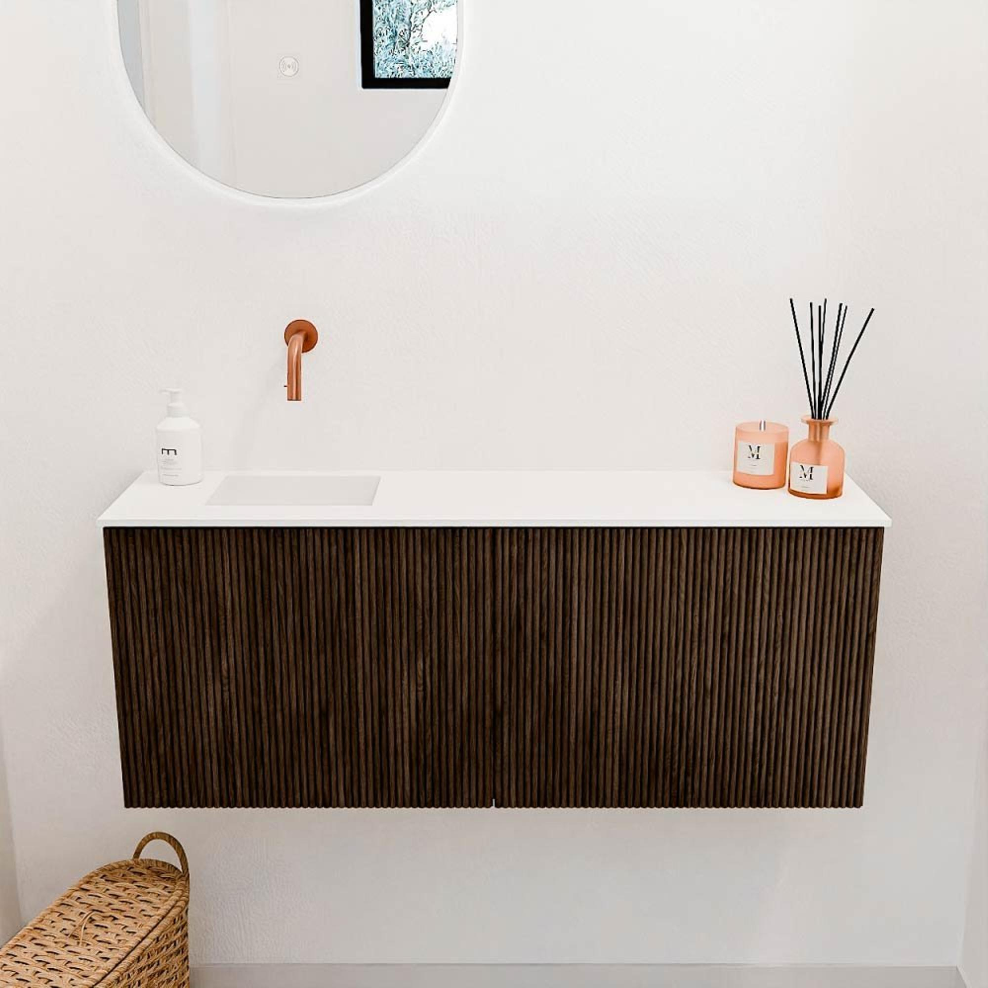 Avec ce magnifique meuble, vous donnez immédiatement à votre salle de bains ou toilette d'invités un aspect élégant et chaleureux. Il combine le charme naturel du noyer avec un design moderne qui s'adapte parfaitement à divers styles d'intérieur. Grâce aux subtiles rainures verticales sur les façades, le meuble obtient un look contemporain et raffiné, qui confère à chaque espace une sensation de luxe. La vasque, réalisée dans une douce couleur talc, est positionnée à gauche et sans trou de robinet, ce qui vous laisse la liberté de choisir un robinet qui correspond parfaitement à vos souhaits. Ce meuble est non seulement un plaisir pour les yeux, mais aussi étonnamment pratique. Avec deux portes spacieuses, vous rangez facilement tous vos accessoires de toilette de manière ordonnée, pour que votre salle de bains reste toujours propre et organisée. Ainsi, vous profitez chaque jour d'un espace frais et organisé où vous aimez passer du temps.