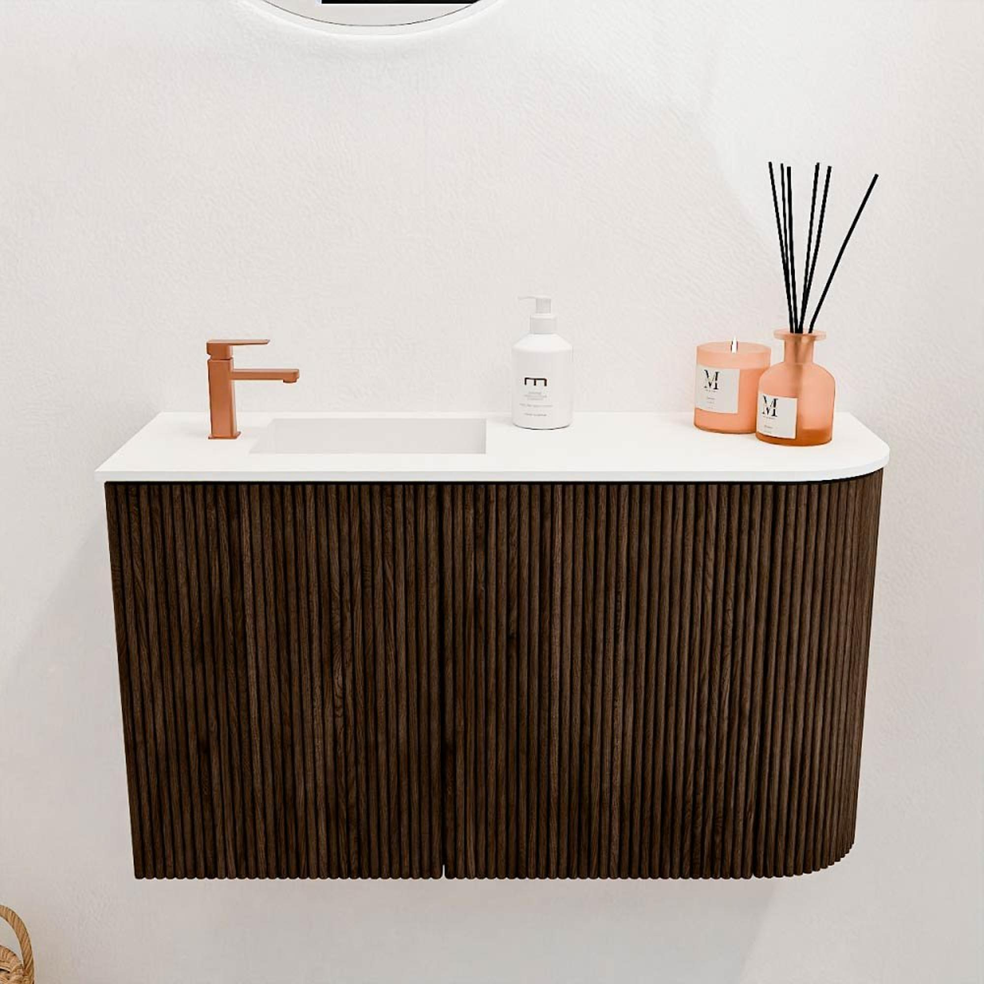La couleur chaude noyer et le motif rainuré sur les façades de l'armoire donnent au meuble un aspect moderne et pourtant intemporel. L'arrondi subtil sur le côté droit crée un effet ludique et élégant, ce qui fait que le meuble attire immédiatement l'œil. En combinant avec la vasque douce couleur talc, un ensemble harmonieux se forme qui convient à presque tous les styles de salle de bains. Ainsi, vous créez un espace chaleureux où vous commencez et terminez chaque jour avec plaisir.