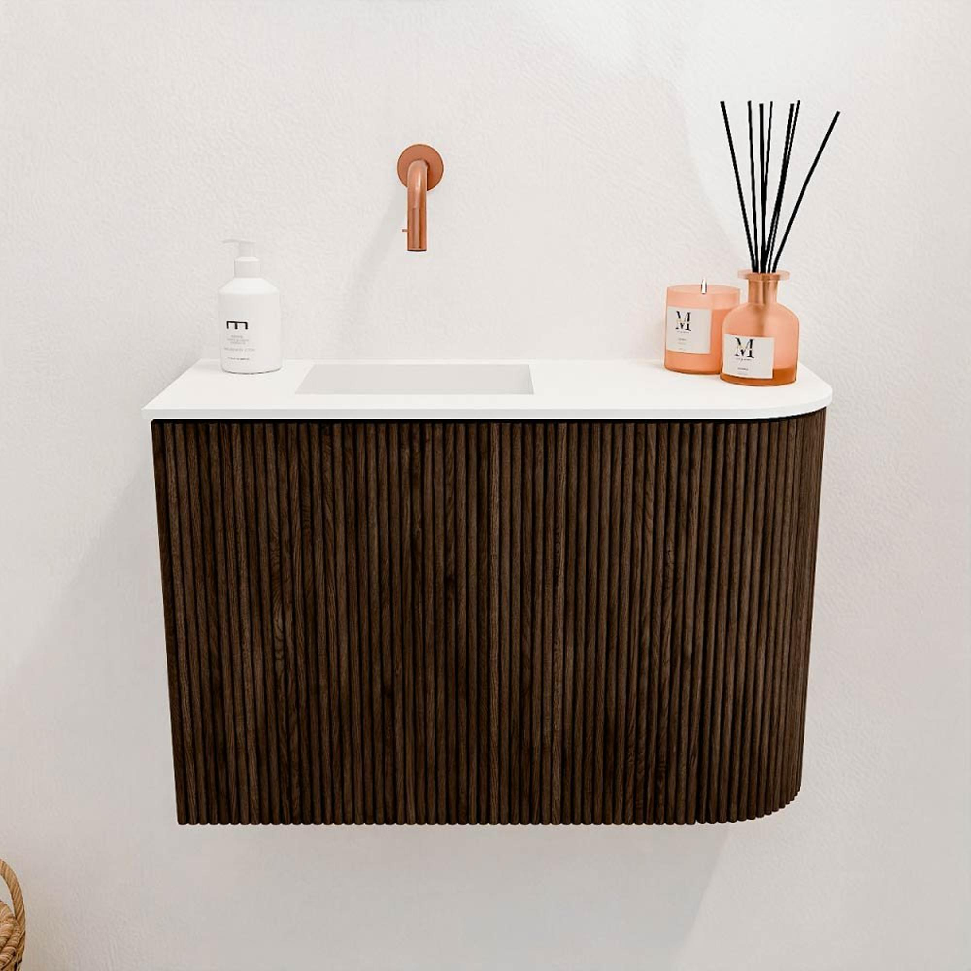 Le meuble dégage une pure élégance grâce à la chaude couleur noyer et à la structure naturelle du bois. La forme arrondie sur le côté droit lui confère un design distinctif qui attire immédiatement le regard. Les rainures verticales sur la façade assurent une finition subtile mais raffinée qui donne à votre salle de bains une allure exclusive. Ce meuble est un choix parfait si vous recherchez une combinaison de design intemporel et d’accents modernes. La couleur talc douce de la vasque crée un beau contraste qui apporte calme et équilibre à votre salle de bains. Ainsi, vous profitez chaque jour d’un environnement stylé qui reflète votre goût personnel.