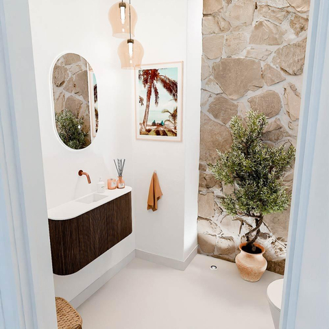 La combinaison de la riche couleur noyer avec la vasque douce couleur talc crée une apparence intemporelle et élégante. Ce meuble est conçu avec un souci du détail, comme les coins arrondis qui donnent une touche douce et moderne à l'ensemble. Grâce à l'utilisation de couleurs et matériaux naturels, il s'adapte facilement à différents styles de salle de bains, du classique au contemporain. Vous créez ainsi une salle de bains qui n'est pas seulement fonctionnelle, mais aussi un véritable point focal. Avec ce meuble, vous apportez un élément stylé chez vous qui reflète parfaitement votre goût personnel.