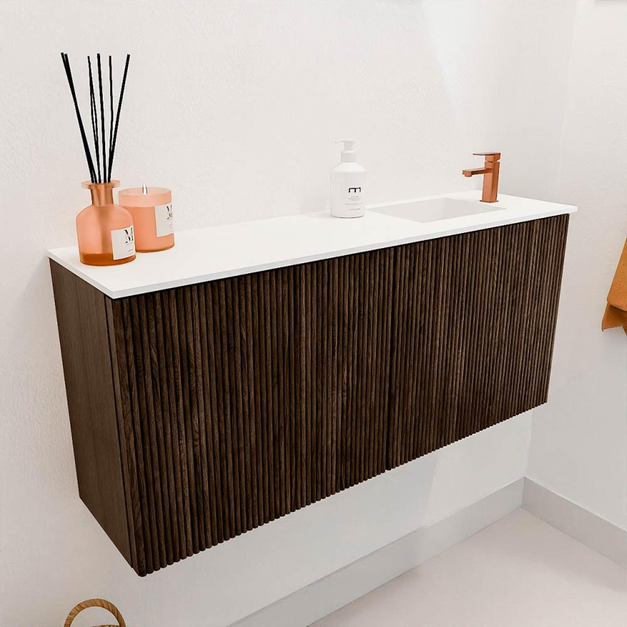 La couleur chaude noyer et l'utilisation de chêne massif sur la façade donnent au meuble un aspect luxueux qui attire immédiatement l'attention. Ce matériau naturel assure une élégance intemporelle qui s'adapte sans effort à différents styles de salle de bains. Grâce à la finition subtile et au design épuré, votre salle de bains devient un lieu dont vous êtes fier. De plus, la combinaison du bois et de la couleur douce de la vasque crée une atmosphère harmonieuse qui invite à la détente.