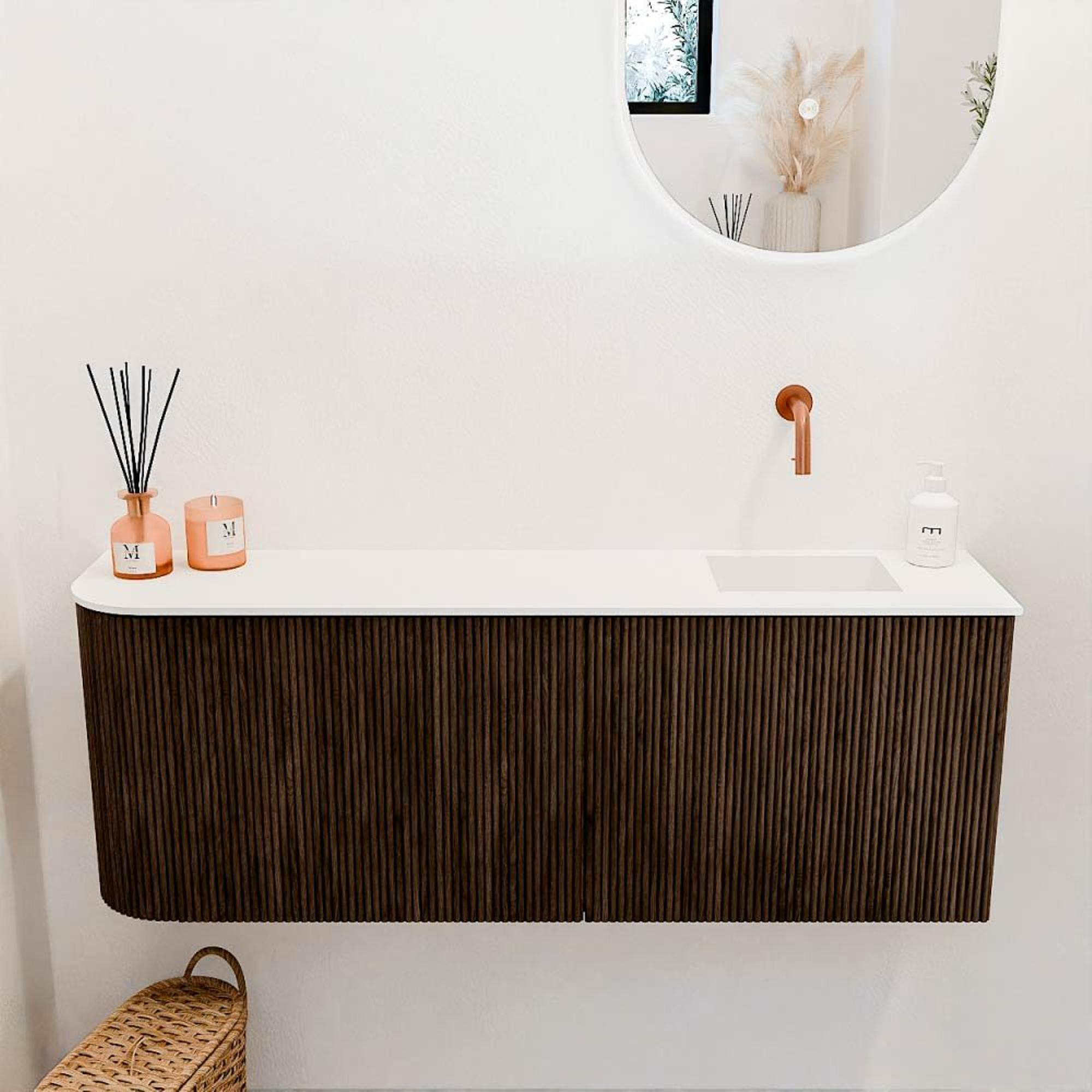 Le meuble se distingue immédiatement par son apparence moderne mais intemporelle. Les rainures verticales sur les façades lui confèrent une texture unique qui est non seulement visuellement attrayante, mais offre aussi une subtile expérience tactile. La couleur chaude noyer avec le veinage naturel du bois crée une atmosphère luxueuse qui donne à votre salle de bains un aspect exclusif. Ce meuble est un véritable point focal, sans être envahissant, et s’intègre aisément dans des salles de bains modernes comme classiques. Ainsi, vous créez un espace où il fait bon vivre chaque jour.