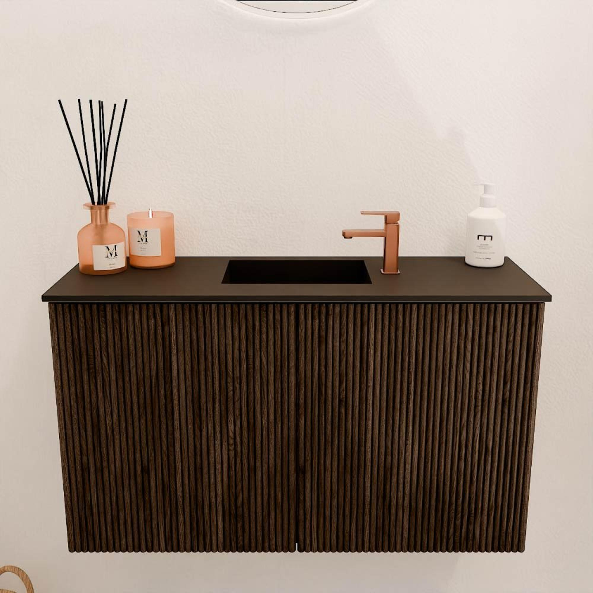 La combinaison du chêne massif et d'une finition noyer chaude assure un aspect intemporel et élégant. La structure rainurée verticale sur les façades donne au meuble un détail unique et raffiné qui attire immédiatement l'attention. Ce meuble s'intègre sans effort dans divers styles d'intérieur, du moderne au classique, et ajoute toujours une touche de luxe à votre salle de bains. Grâce aux tons subtils et aux matériaux naturels, vous créez une atmosphère chaleureuse qui invite à la détente.