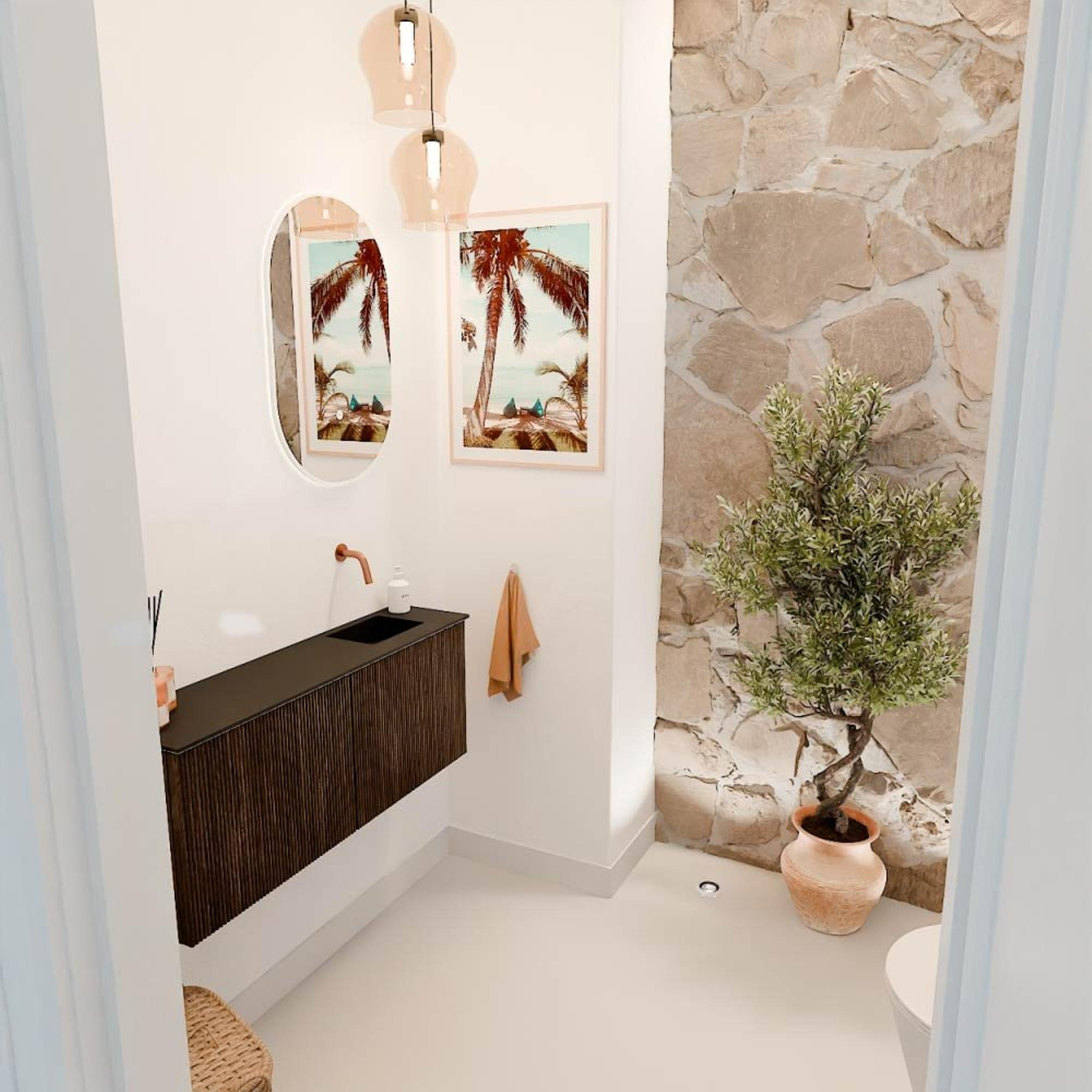 Avec ce magnifique meuble, vous donnez immédiatement à votre salle de bains ou toilette d'invités une ambiance chaleureuse et naturelle. Il combine un design intemporel avec une fonctionnalité intelligente, ce qui le rend non seulement esthétique, mais aussi parfaitement adapté à votre usage quotidien. La subtile structure rainurée sur les façades ajoute un détail ludique mais élégant, tandis que la couleur chaude noyer crée une sensation de calme et de luxe. Grâce à ses dimensions compactes, ce meuble s'intègre facilement dans des espaces plus petits sans sacrifier l'espace de rangement. La vasque, avec ses lignes épurées et sa forme pratique, est positionnée à droite et offre amplement d'espace pour ranger soigneusement vos accessoires de salle de bains. Ainsi, vous profitez d'une salle de bains ordonnée et chaleureuse qui invite à la détente.