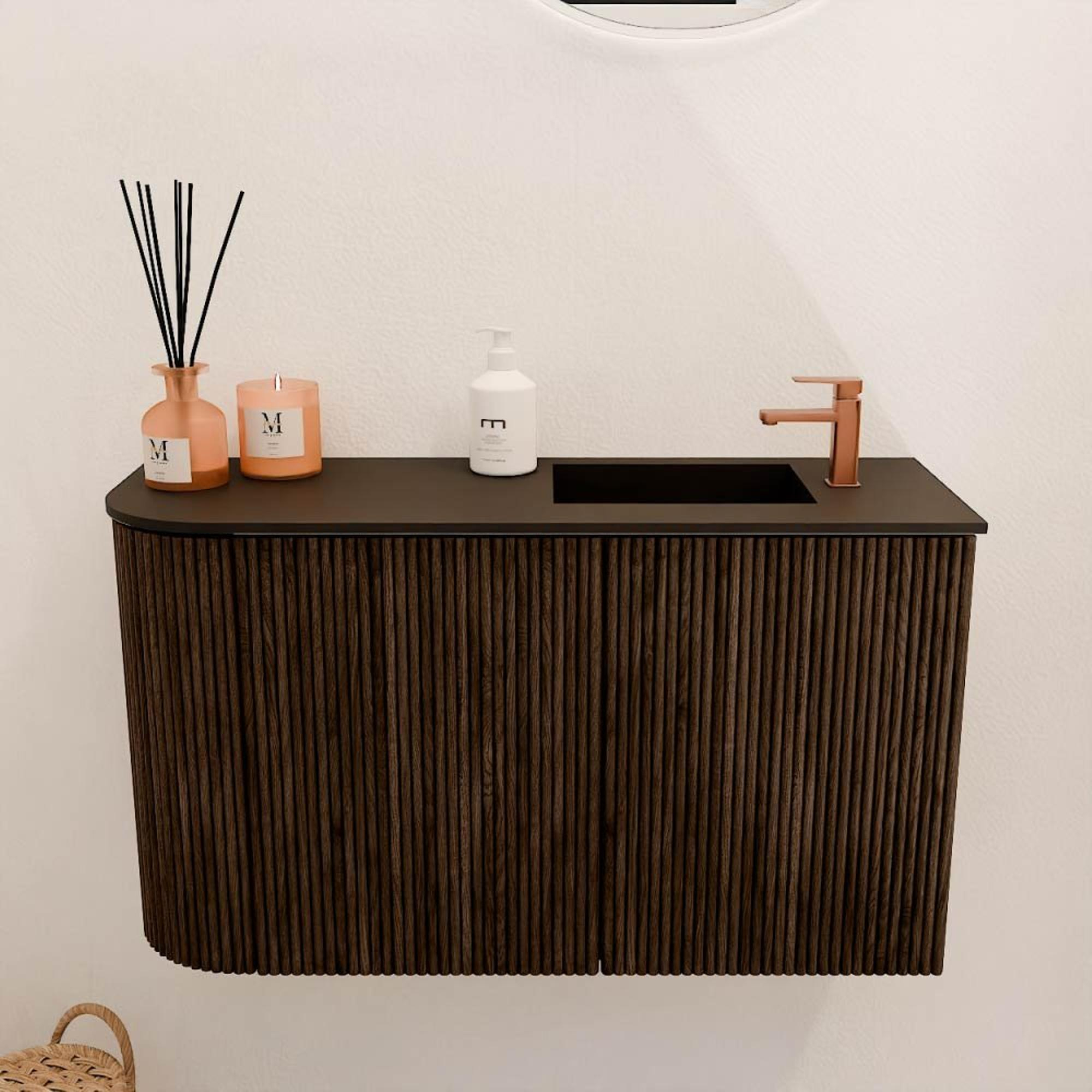 Ce meuble se distingue immédiatement par son design élégant. La couleur chaude noyer et le doux arrondi à gauche lui donnent une apparence unique qui se ressent à la fois moderne et naturelle. La vasque de couleur Urban ajoute un contraste subtil, donnant à l’ensemble un look frais et contemporain. Grâce à la finition de haute qualité et à l’utilisation de chêne massif et de contreplaqué plaqué chêne, le meuble dégage une pure classe. Vous ajoutez ainsi non seulement un élément fonctionnel, mais aussi un véritable point focal qui donne à votre salle de bains une atmosphère personnelle et raffinée.