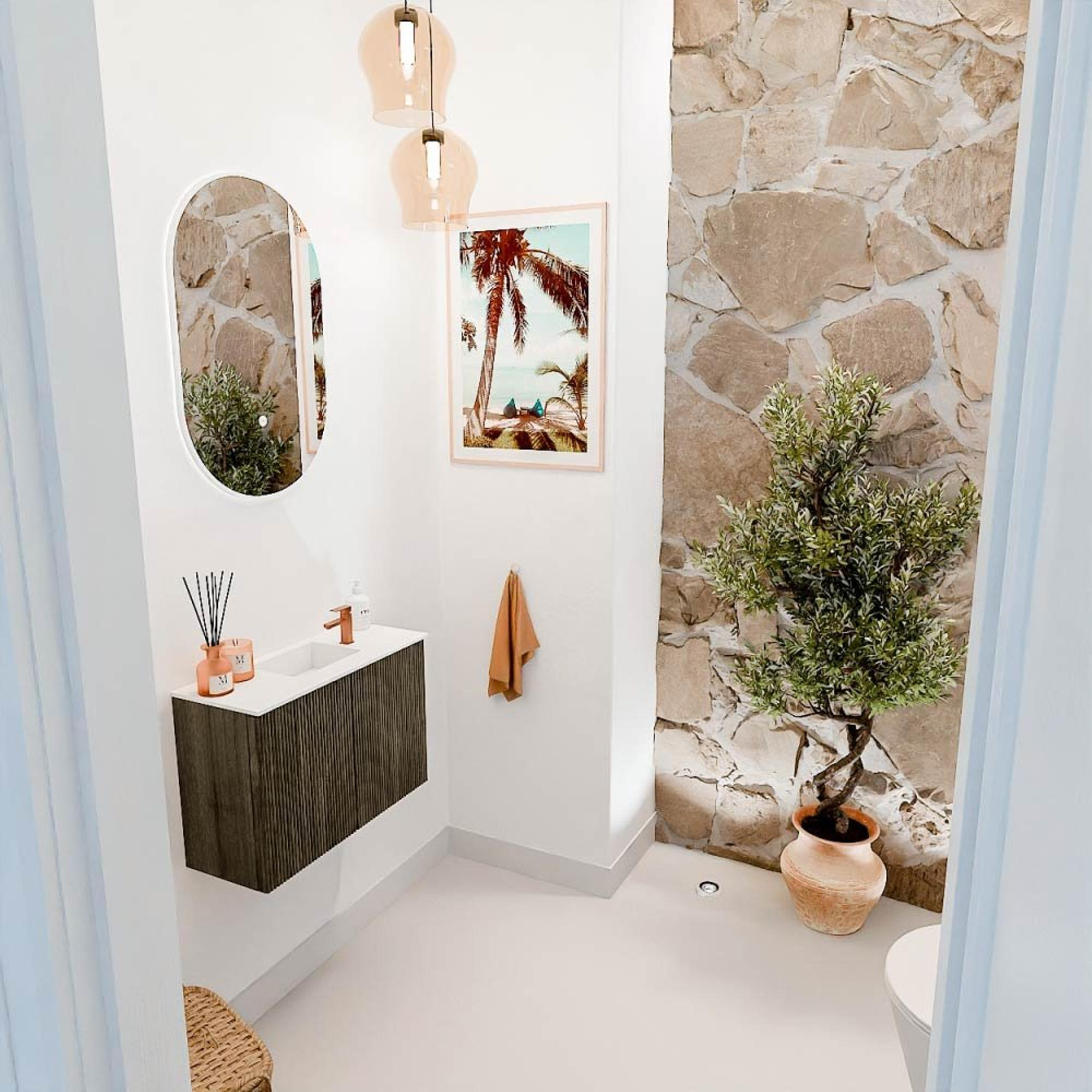 Avec sa finition bois naturel et sa couleur profonde et sombre Shadow, ce meuble est un véritable point focal. Le panneau avant en chêne massif donne un aspect robuste et authentique, qui se combine aisément avec différents styles de salle de bains. Que vous choisissiez un intérieur moderne, campagnard ou industriel, ce meuble s'adapte et ajoute immédiatement de l'ambiance. La subtile texture nervurée sur le panneau avant crée un effet ludique sans dominer. Ainsi, vous profitez d'une salle de bains qui est non seulement fonctionnelle, mais aussi invitante à la détente.