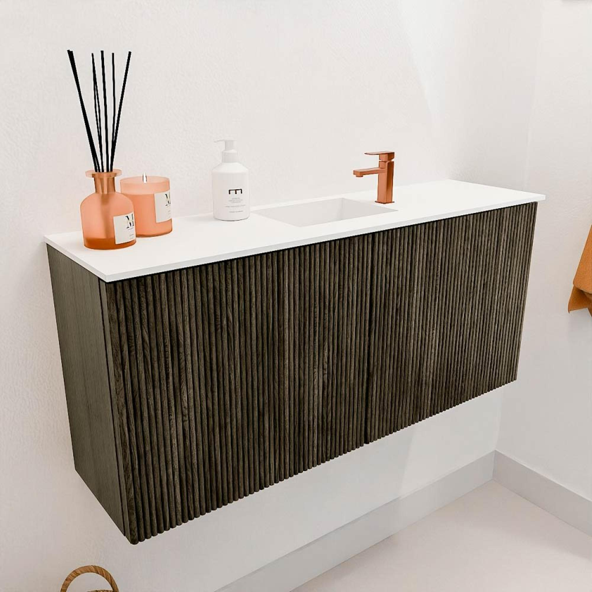La couleur sombre 'Shadow' du meuble, inspirée du chêne avec une teinte anthracite, donne à votre salle de bains une apparence chaleureuse et pourtant moderne. Les rainures verticales sur les façades créent un accent de design subtil mais remarquable qui attire immédiatement l'attention. Cette combinaison de texture bois naturelle et de détails contemporains fait du meuble un véritable point focal. Ainsi, vous profitez non seulement de la fonctionnalité, mais aussi d'une salle de bains qui a l'air soignée et luxueuse.