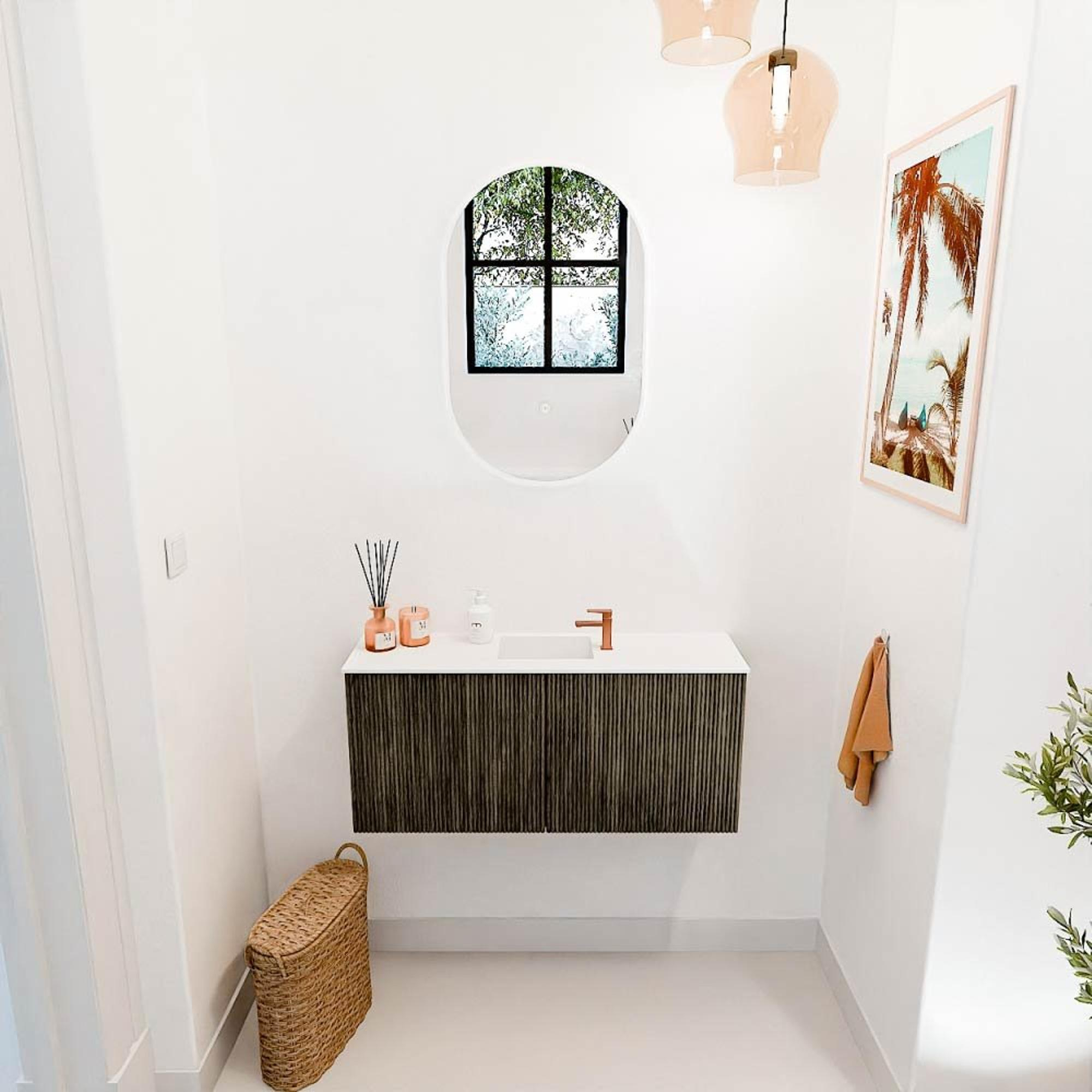 Avec ce magnifique meuble, vous donnez immédiatement à votre salle de bains un aspect élégant et moderne. Il combine un aspect bois foncé raffiné avec une vasque mate épurée dans une teinte claire, ce qui crée un beau contraste et une atmosphère apaisante. Grâce aux dimensions intelligentes de 90 cm de largeur, le meuble s'adapte parfaitement aussi bien aux salles de bains compactes que spacieuses. Le meuble offre non seulement une apparence élégante, mais aussi un espace de rangement pratique pour garder votre salle de bains propre et ordonnée. La combinaison de matériaux de haute qualité garantit que vous profiterez de ce meuble pendant de nombreuses années, tandis que la subtile structure à rainures verticales sur les façades ajoute une touche contemporaine. Ainsi, vous transformez votre salle de bains en un lieu où vous commencez et terminez chaque jour avec plaisir.