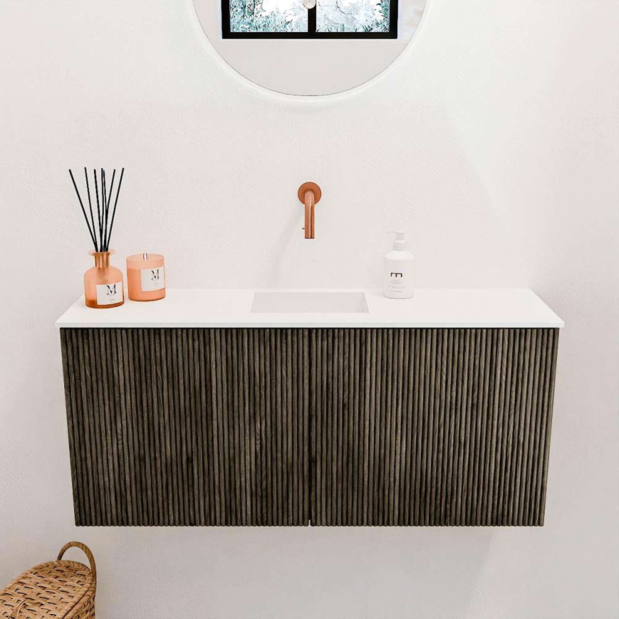 Avec ses rainures verticales et la couleur élégante Shadow, qui rappelle le chêne anthracite, ce meuble est un véritable accroche-regard. Le design combine des lignes modernes avec une apparence chaleureuse et naturelle, ce qui le rend parfait pour différents styles de salle de bains. La vasque en Talc ajoute un contraste subtil, donnant à l'ensemble une touche fraîche et légère. Ainsi, vous créez une salle de bains qui n'est pas seulement fonctionnelle, mais aussi un lieu dont vous êtes fier.