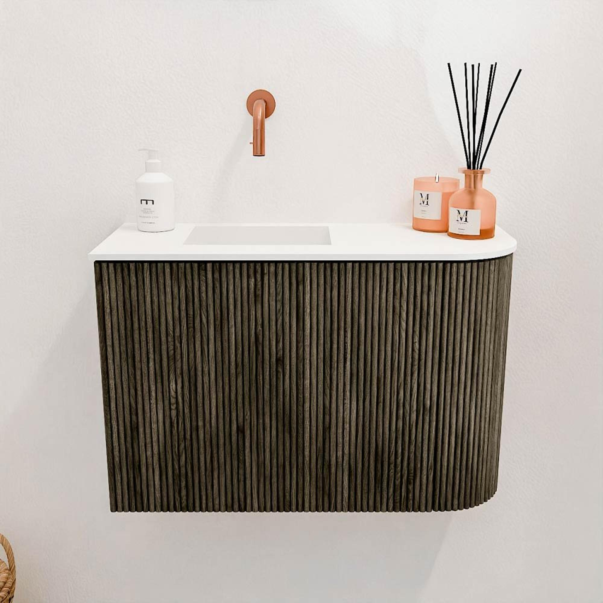 Le meuble se distingue immédiatement par son apparence élégante. La combinaison de la couleur profonde Shadow avec les panneaux avant en chêne massif chaud apporte une touche luxueuse et naturelle à votre salle de bains. La structure rainurée sur le devant ajoute un élément subtilement ludique, faisant du meuble non seulement un objet fonctionnel, mais aussi un véritable point de mire. Grâce au design intemporel, il s'intègre sans effort dans divers styles d'intérieur, du moderne au classique. Vous profitez ainsi pendant des années d'un meuble de salle de bains qui ne se démode jamais.