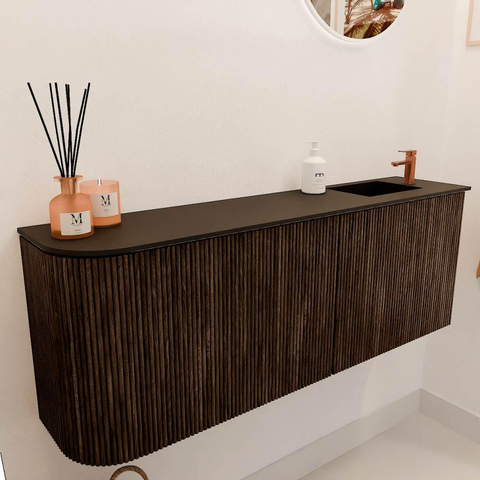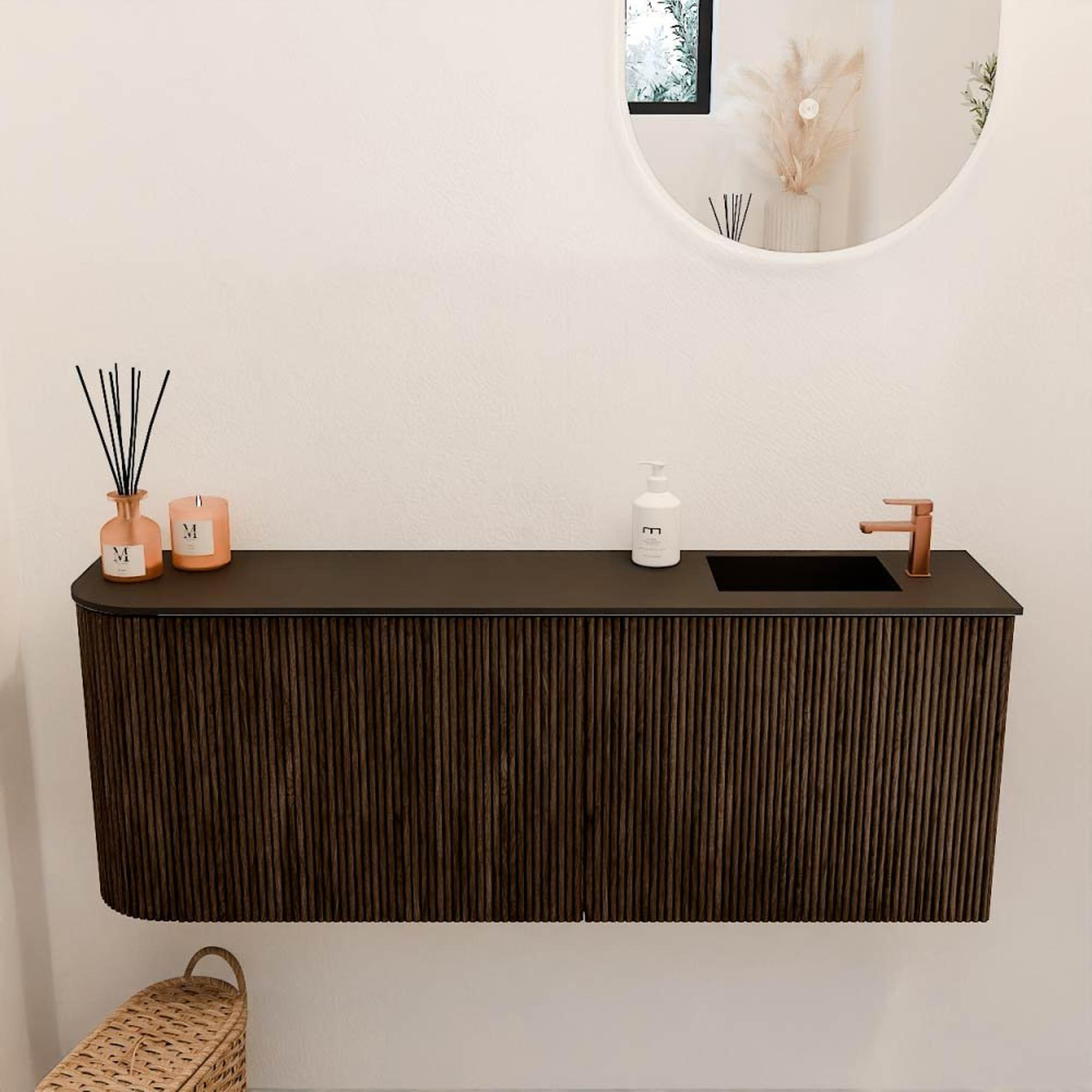 Le meuble attire immédiatement l'attention grâce à son design moderne avec des rainures verticales qui donnent une texture subtile et de la profondeur à la façade. La couleur chaude noyer combinée à la structure naturelle du bois assure un aspect intemporel qui s'adapte facilement à différents styles d'intérieur. Que vous optiez pour une salle de bains moderne et épurée ou que vous souhaitiez créer une ambiance chaleureuse et naturelle, ce meuble ajoute toujours une touche élégante. Le côté gauche arrondi rend le design particulier et offre une apparence douce et accueillante qui donne un petit plus à votre salle de bains.