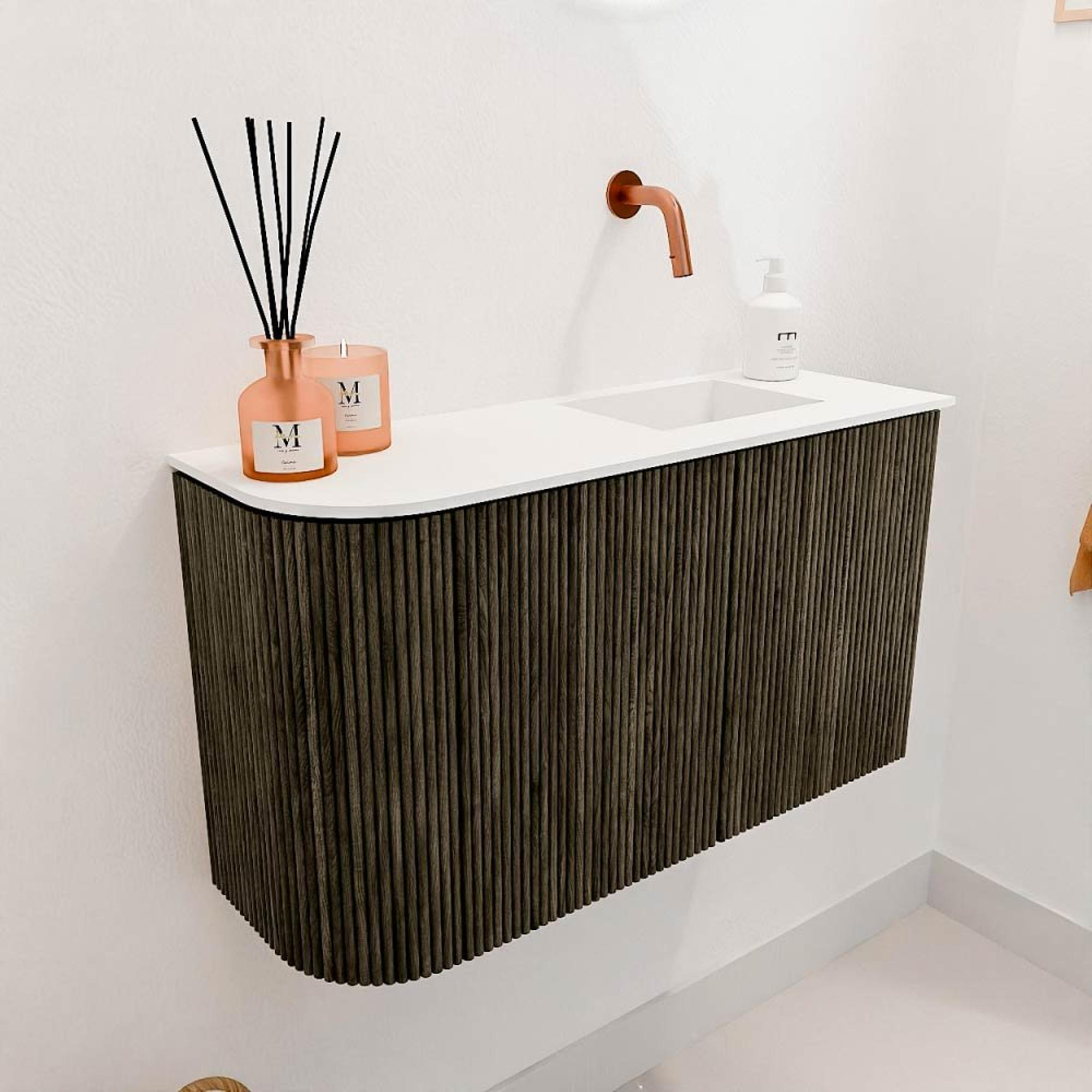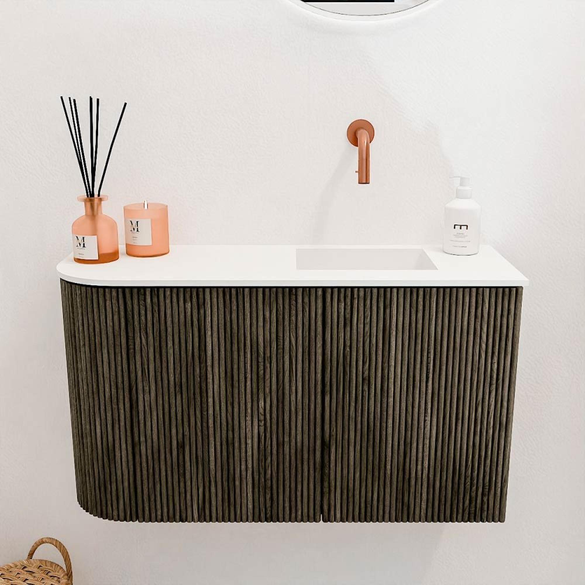 La couleur ombre profonde et le motif rainuré vertical donnent à ce meuble une apparence unique et élégante. Le bois de chêne naturel à l'avant ajoute chaleur et caractère, faisant de ce meuble un véritable point focal dans votre salle de bains. Par la combinaison d'éléments modernes et classiques, le meuble s'intègre sans effort dans différents styles d'intérieur. Vous profitez ainsi d'une salle de bains qui n'est pas seulement fonctionnelle, mais aussi un lieu chaleureux où vous aimez passer du temps chaque jour.