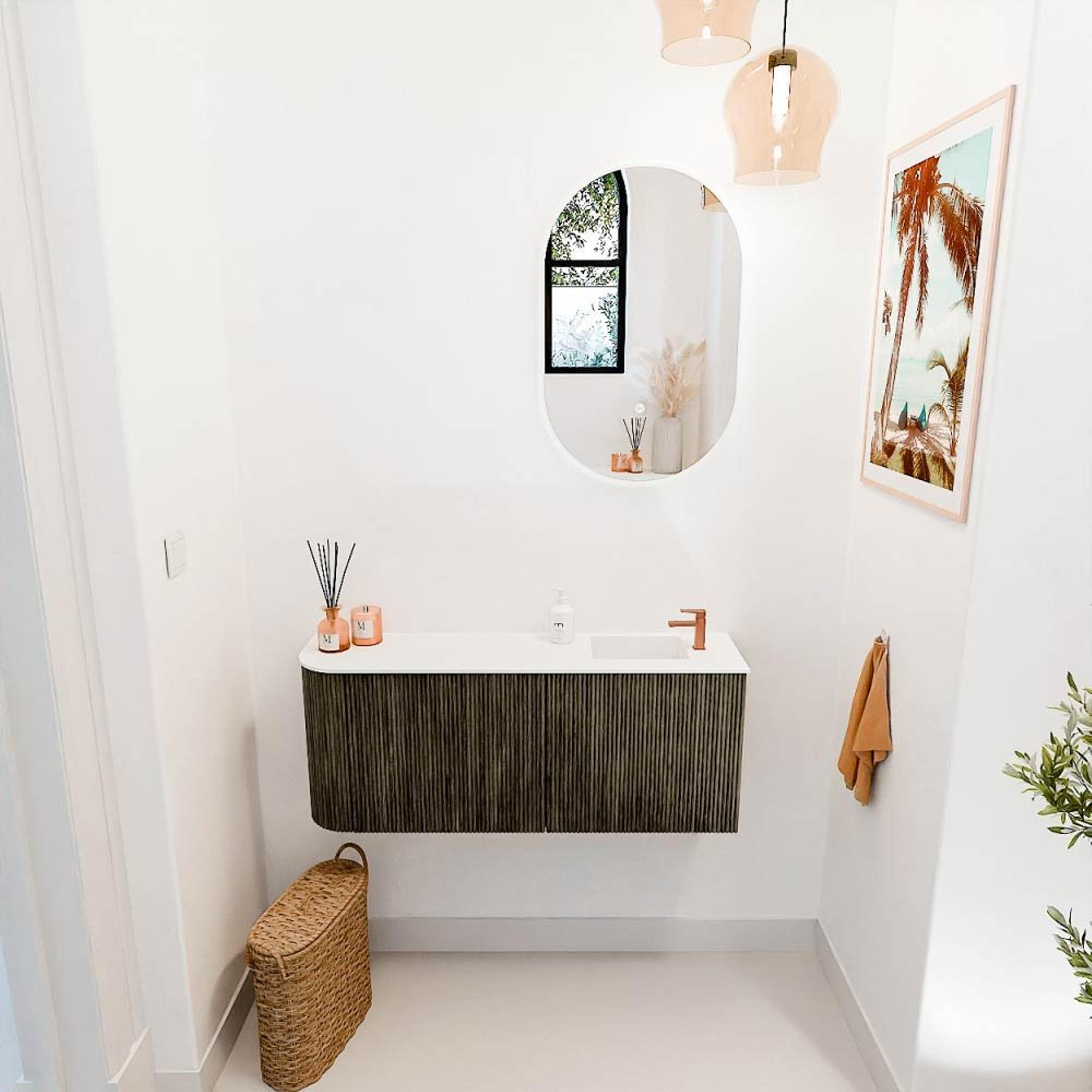 Le meuble se distingue immédiatement par la structure à rainures verticales en chêne massif, qui donne un aspect moderne et naturel. La combinaison de la couleur sombre Shadow avec la vasque claire Talc offre un look intemporel et élégant qui s'adapte aisément à divers styles de salle de bains. Grâce à l'arrondi subtil sur le côté gauche, le meuble acquiert un caractère ludique et unique, donnant à votre salle de bains une touche personnelle. Ainsi, vous profitez chaque jour d'un environnement stylé qui dégage calme et confort.
