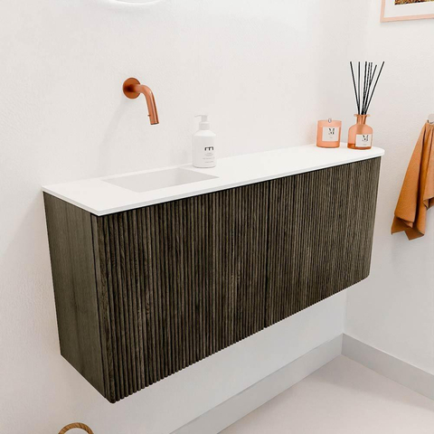 La combinaison de la couleur Shadow profonde avec la vasque douce Talc donne à ce meuble un aspect intemporel et élégant. L'arrondi subtil sur le côté droit crée un design unique qui attire immédiatement l'attention sans dominer. Grâce à la structure nervurée sur les façades, le meuble gagne une dimension supplémentaire, ce qui crée un effet ludique et moderne. Cela rend le meuble parfait pour ceux qui aiment une salle de bains avec du caractère et une touche personnelle. Avec ce meuble, vous apportez un véritable point fort chez vous qui s'adapte facilement à différents styles d'intérieur.