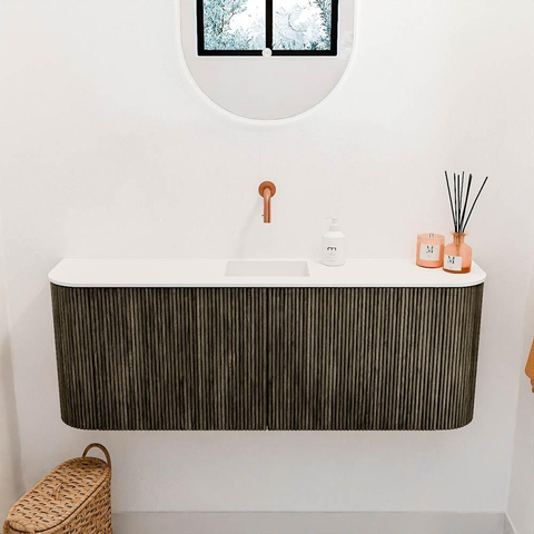 Le meuble se distingue immédiatement par sa façade à rainures verticales élégantes, qui offre une apparence moderne et raffinée. Les côtés arrondis apportent une forme douce et organique qui donne un caractère ludique sans dominer l'ensemble. L'association de la couleur profonde Shadow avec la vasque claire Talc crée un contraste subtil qui donne à votre salle de bains un look frais et contemporain. Ce meuble est un choix parfait si vous recherchez un design à la fois intemporel et tendance.
