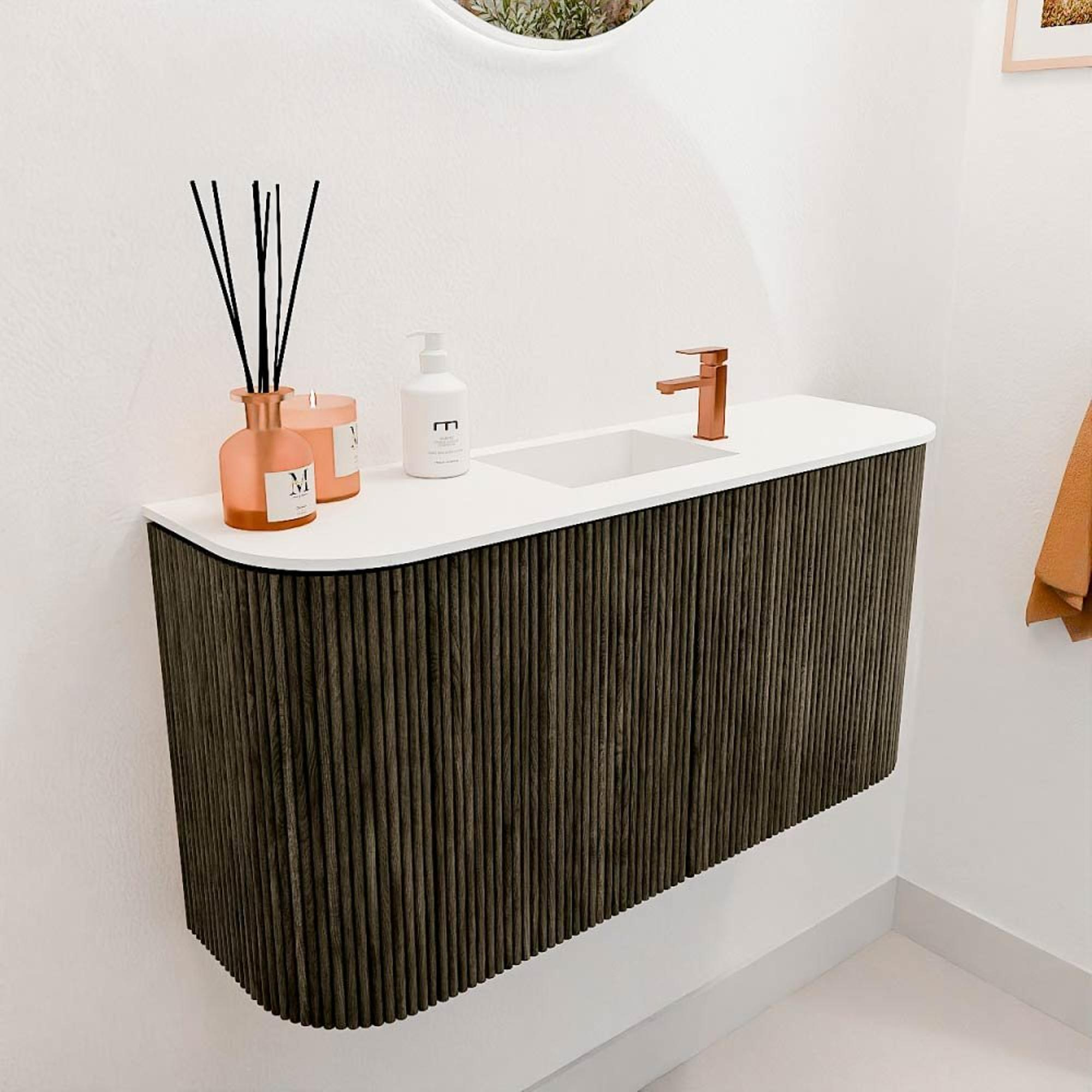 Avec sa structure nervurée et les courbes douces des deux côtés, ce meuble est un véritable accroche-regard. La combinaison de la couleur profonde Shadow avec le lavabo clair Talc crée un magnifique contraste qui enrichit chaque espace. Ce meuble ajoute non seulement du caractère, mais s'intègre également sans effort dans divers styles d'intérieur, du moderne au classique. Vous donnez ainsi à votre salle de bains ou toilettes d'invités une apparence unique dont vous pouvez être fier.