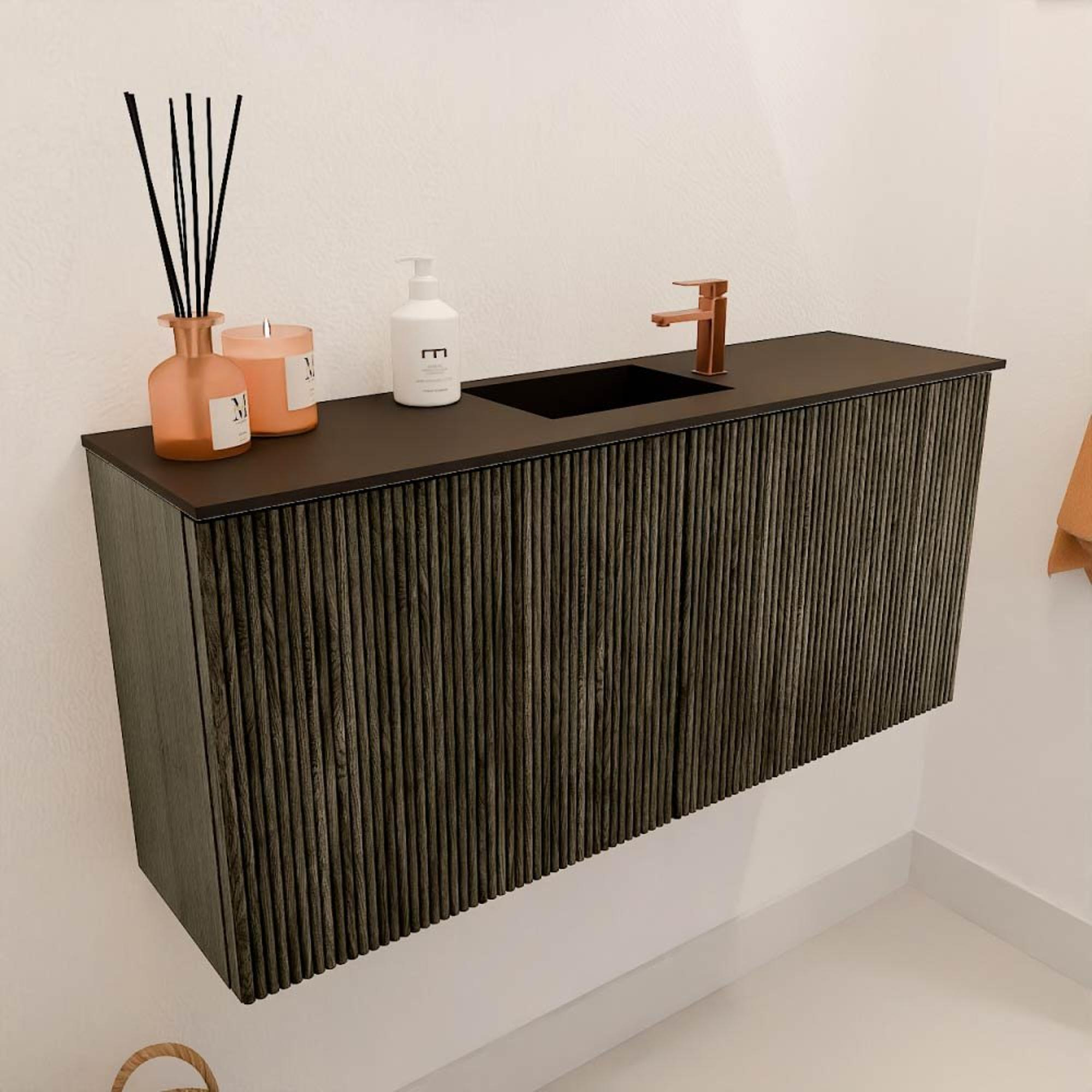 Les façades striées de ce meuble donnent à votre salle de bains un aspect unique et moderne. La couleur Shadow est une teinte profonde et élégante qui se combine sans effort avec différents styles de salle de bains, du minimaliste à l'industriel. Grâce au relief subtil, un effet ludique se crée, donnant au meuble ce petit plus de caractère. Vous créez ainsi une salle de bains qui n'est pas seulement fonctionnelle, mais aussi un véritable point de mire. La vasque en couleur Urban s'harmonise parfaitement et assure une expérience totale harmonieuse et élégante.