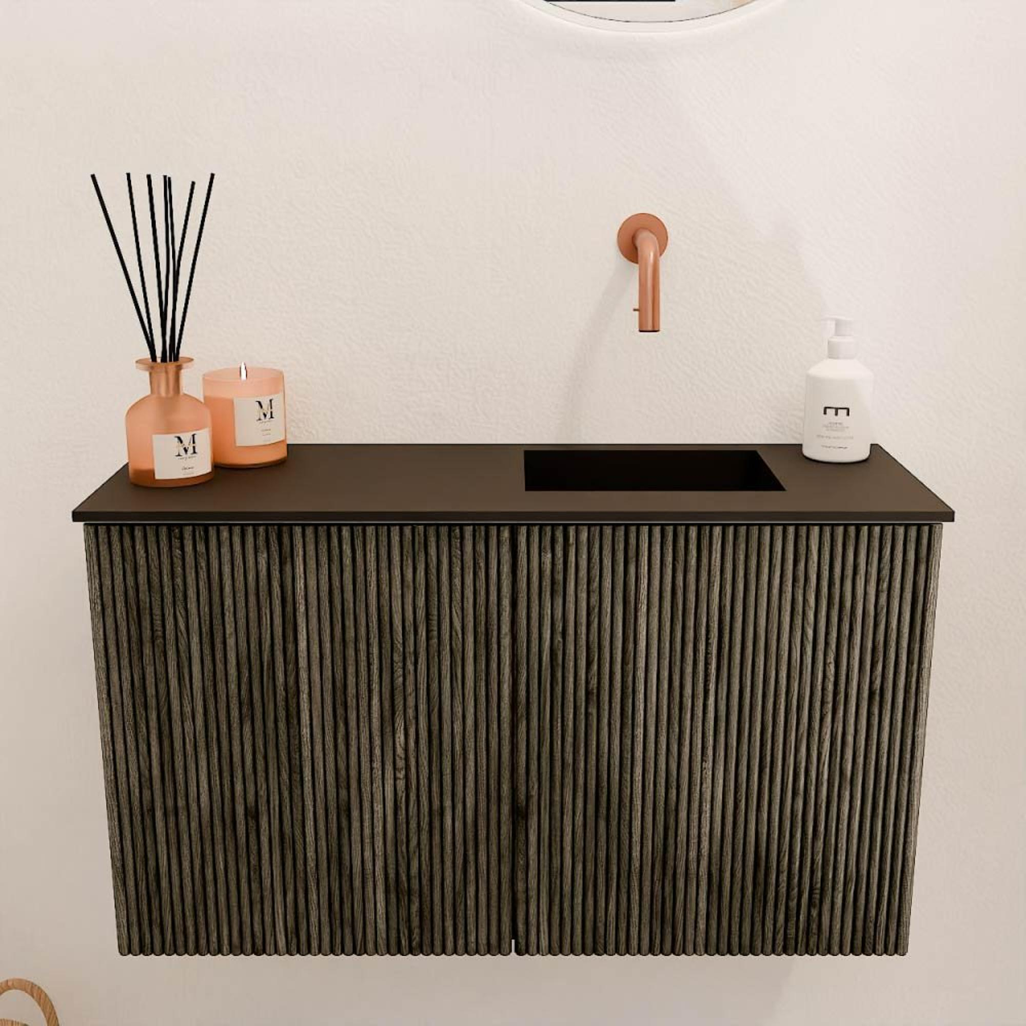 Ce meuble se distingue immédiatement par son design intemporel et son aspect naturel. Les façades en chêne massif apportent une atmosphère chaleureuse et authentique, tandis que la couleur Shadow ajoute une touche moderne. La finition rainurée confère au meuble une texture subtile qui lui donne un caractère supplémentaire. Vous combinez ainsi sans effort un look naturel avec une élégance contemporaine. Cela fait du meuble non seulement un élément fonctionnel, mais aussi un véritable point focal dans votre salle de bains.