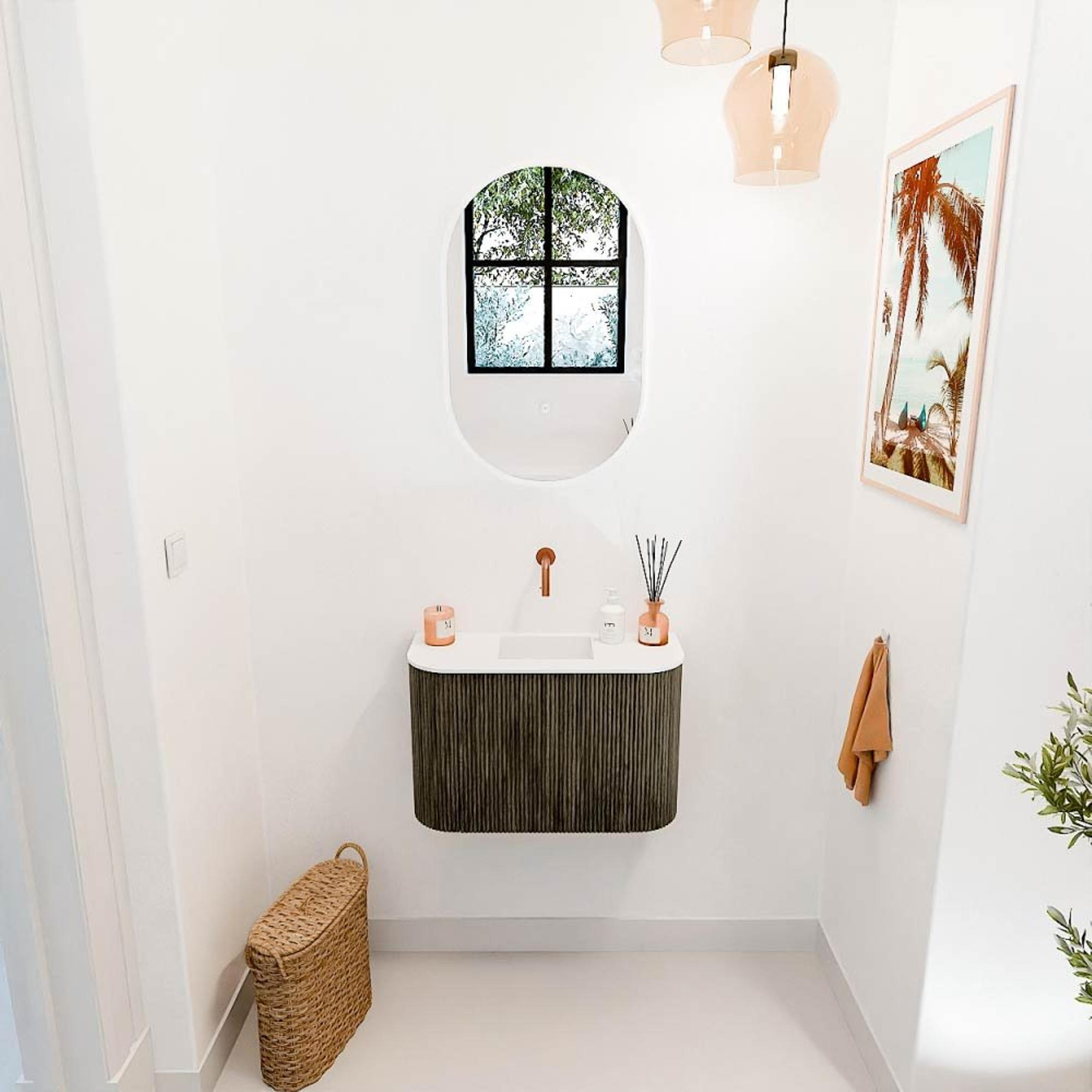 Avec ce magnifique meuble, vous donnez immédiatement à votre salle de bains un aspect élégant et naturel. Le format compact le rend idéal pour les petits espaces, sans compromettre le design ou la fonctionnalité. L'association du bois de couleur Shadow chaud et foncé avec la vasque douce et claire Talc crée un beau contraste qui dégage calme et élégance. Grâce aux courbes subtiles des deux côtés, le meuble est accueillant et doux au toucher, tandis que les rainures verticales sur les panneaux avant ajoutent un détail ludique et contemporain. Ce meuble invite à transformer votre salle de bains en un lieu où vous commencez et terminez chaque jour avec plaisir.