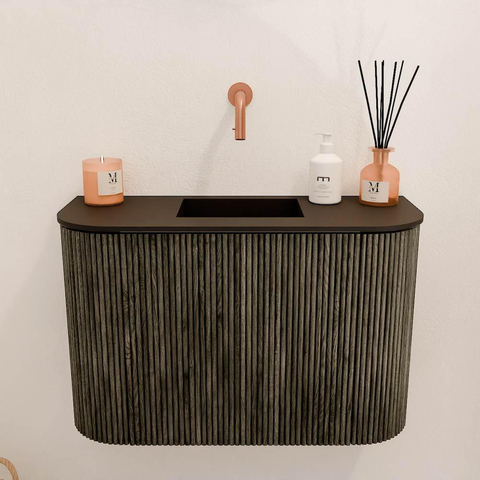 Le meuble se distingue immédiatement par son design raffiné avec des coins arrondis des deux côtés. Ces arrondis doux donnent à l'ensemble une apparence moderne et pourtant intemporelle qui s'adapte aisément à divers styles d'intérieur. La couleur Shadow combinée à la vasque Urban crée un contraste subtil qui dégage de l'élégance sans dominer. Cela fait du meuble un véritable point focal dans votre salle de bains, apportant en même temps calme et équilibre. Grâce à son design minimaliste, il s'intègre parfaitement dans les petits espaces, sans paraître encombré ou désordonné.