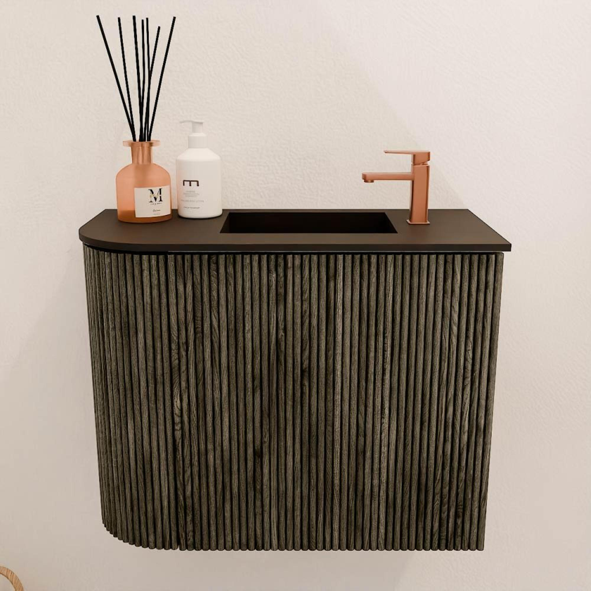 La structure nervurée élégante à l'avant donne au meuble une apparence unique et moderne qui attire immédiatement l'œil. La combinaison d'une couleur mate et sombre avec l'aspect naturel du chêne massif offre un design intemporel qui s'adapte facilement à différents styles d'intérieur. Ce meuble est un véritable point focal qui donne à votre salle de bains une ambiance luxueuse et chaleureuse. Grâce aux détails subtils et à la finition de haute qualité, l'ensemble semble particulier et exclusif, sans être dominant.