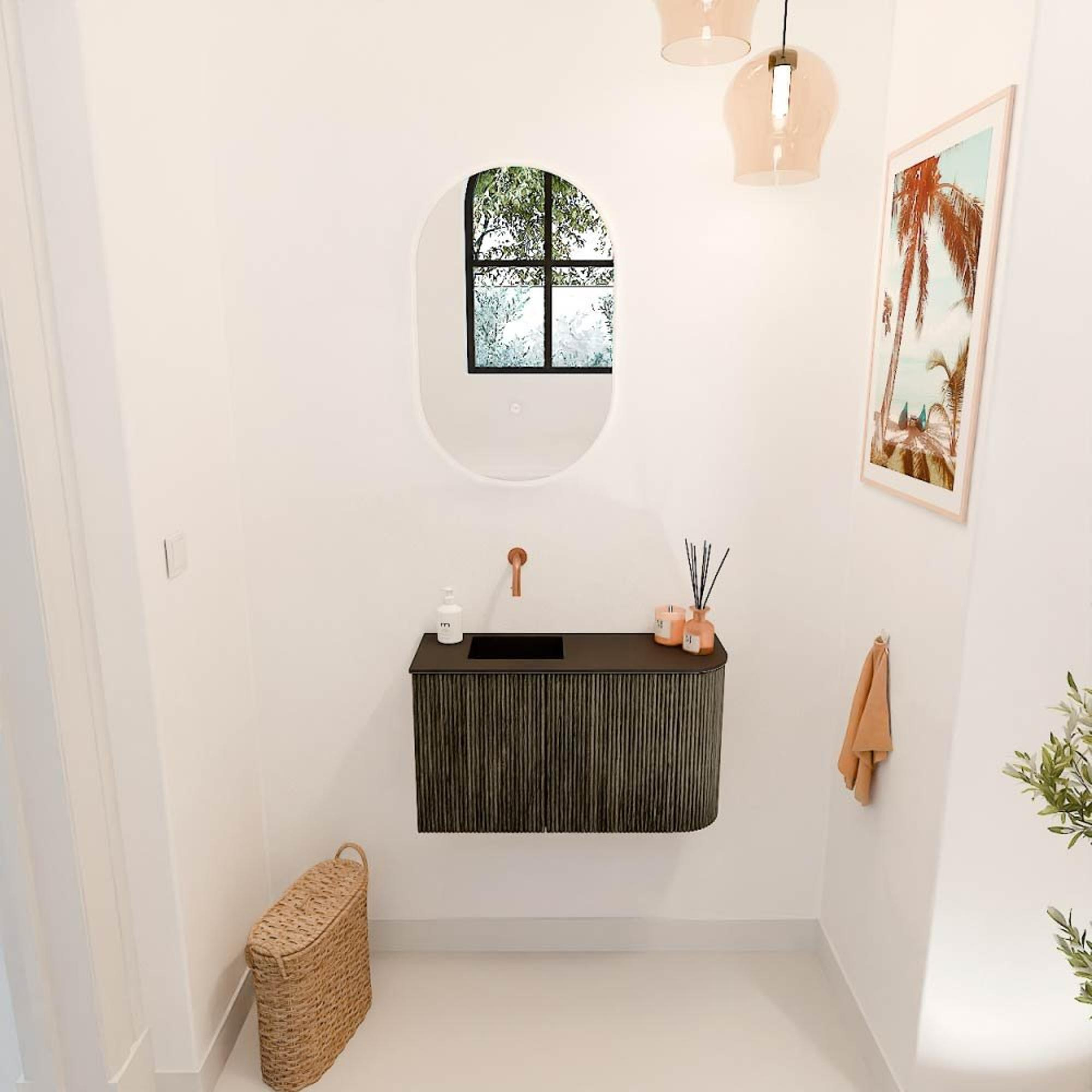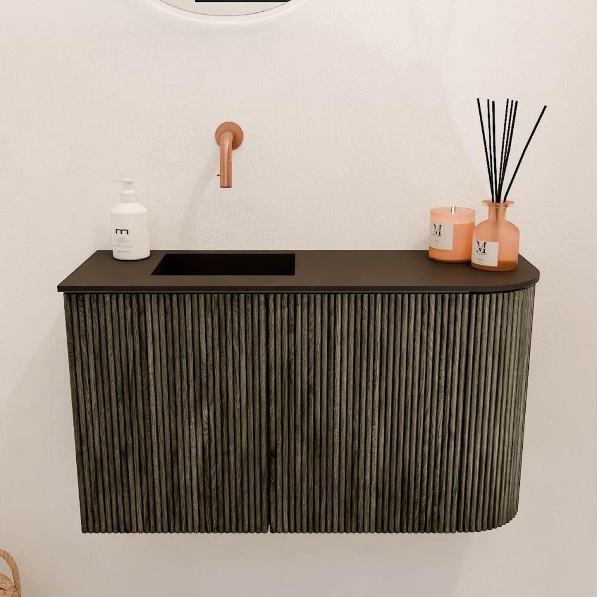 Le meuble se distingue immédiatement par la structure nervurée élégante sur la façade, réalisée en chêne massif. Ce matériau naturel confère une apparence chaleureuse et authentique qui donne immédiatement à votre salle de bains une sensation de luxe. La combinaison avec le placage de chêne sur les côtés crée un ensemble subtil et raffiné. La couleur Shadow est profonde et atmosphérique, ce qui fait que le meuble s'adapte parfaitement aux salles de bains modernes comme classiques. La finition arrondie sur le côté droit donne au meuble un caractère unique, qui apporte ce petit plus à votre salle de bains. Ainsi, vous profitez non seulement d'un meuble fonctionnel, mais aussi d'une pièce maîtresse élégante dont vous pouvez être fier.
