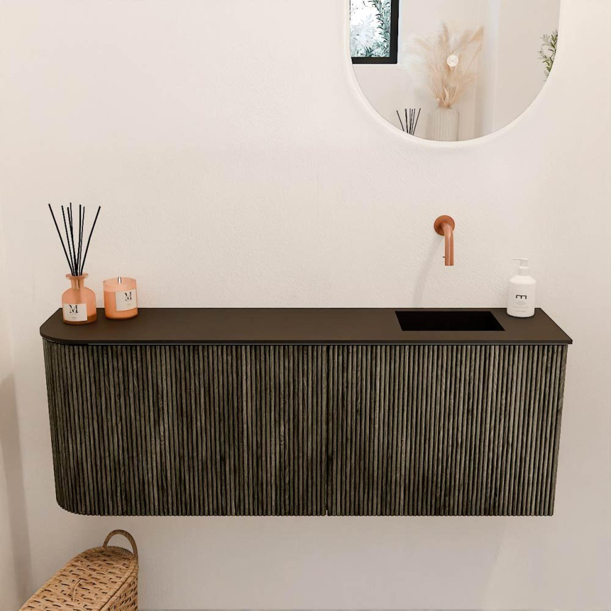 La combinaison de chêne massif pour les façades et de placage chêne sur les côtés confère au meuble une apparence naturelle et luxueuse. La couleur sombre Shadow ajoute une élégance intemporelle à la fois moderne et chaleureuse. Grâce à la conception arrondie sur le côté gauche, le meuble possède un caractère unique qui attire immédiatement l'attention. Cela en fait non seulement un élément fonctionnel, mais aussi un véritable point focal dans votre salle de bains. Avec ce meuble, vous optez pour un accent élégant qui donne immédiatement plus d'ambiance et de classe à votre espace.
