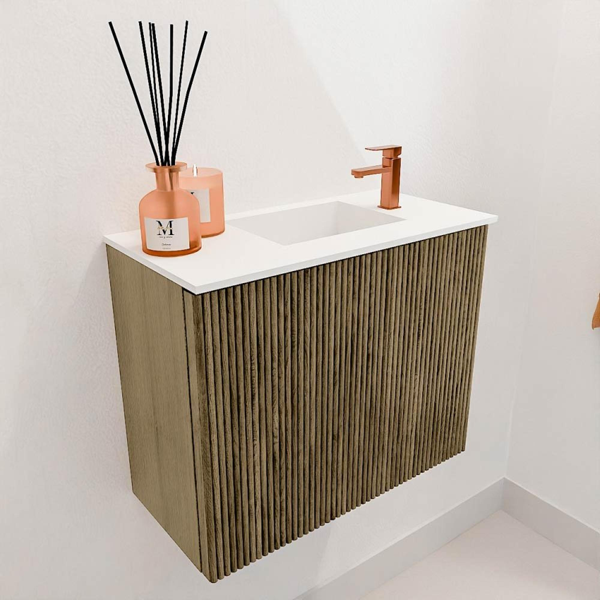 Avec ce magnifique meuble, vous donnez immédiatement à votre salle de bains ou toilette d'invités une apparence élégante et chaleureuse. Le format compact le rend idéal pour les petits espaces, sans compromettre la fonctionnalité ou le design. La combinaison de chêne massif et de placage chêne crée une ambiance naturelle et luxueuse, donnant à votre salle de bains un aspect intemporel et de haute qualité. Grâce à la couleur subtile Dusk avec une vasque douce couleur talc, ce meuble s'intègre facilement dans différents styles d'intérieur, du moderne au classique. La structure verticale cannelée à l'avant ajoute un détail ludique et élégant, faisant de ce meuble un véritable point de mire. Avec la vasque à droite et un trou de robinet, l'ensemble est également pratique et convivial. Vous profitez ainsi chaque jour d'une salle de bains qui non seulement est belle, mais correspond parfaitement à vos souhaits et routines quotidiennes.