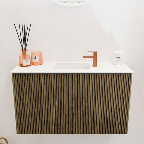 Le meuble se distingue immédiatement par le motif unique de rainures sur les façades, ce qui crée un design ludique tout en restant épuré. La couleur Dusk donne une apparence calme et naturelle qui se combine sans effort avec différents styles de salle de bains. Grâce aux teintes subtiles et à l’utilisation de matériaux de haute qualité, le meuble dégage un luxe sans être envahissant. Ainsi, vous ajoutez une élégance intemporelle à votre salle de bains que vous apprécierez chaque jour.