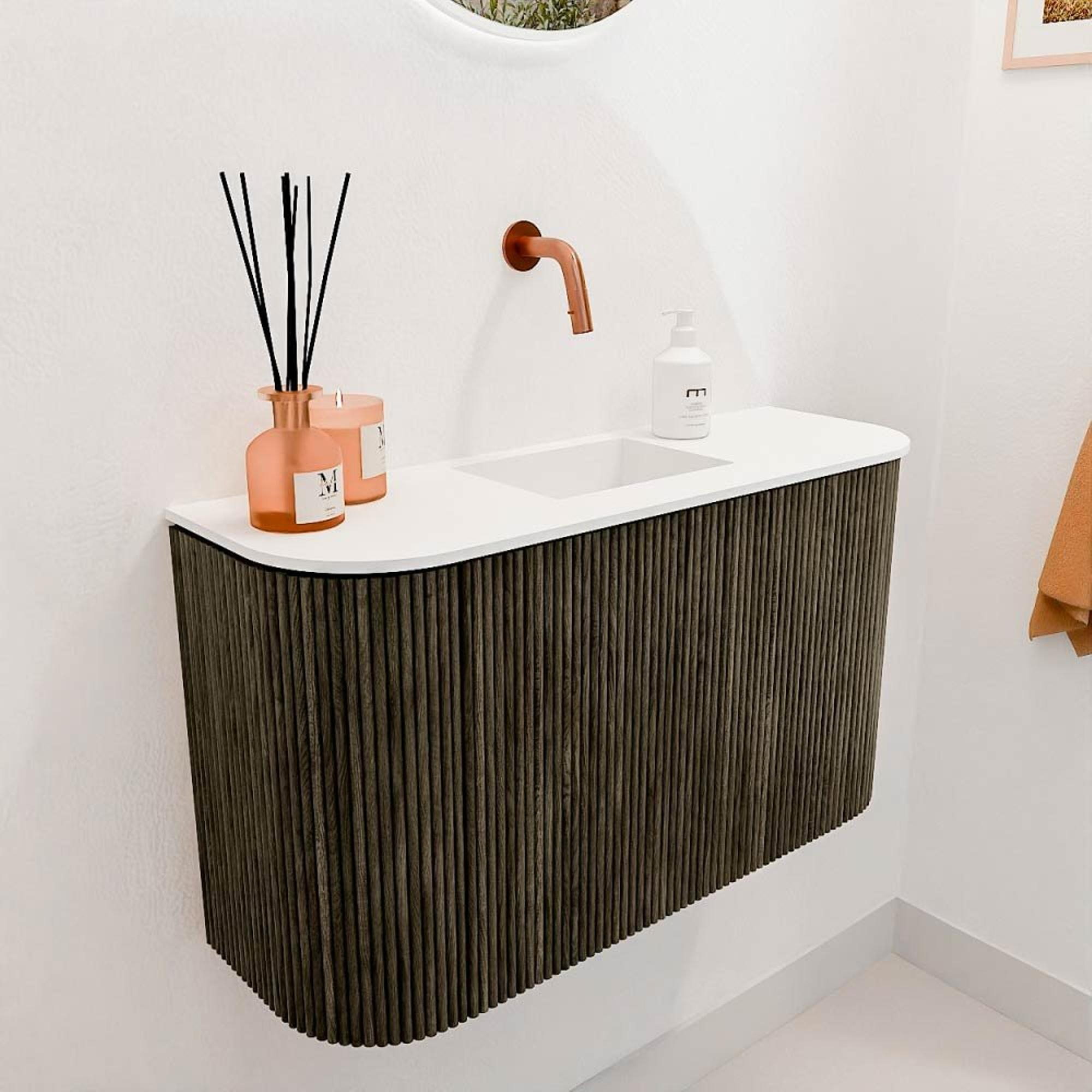 Le meuble se distingue immédiatement par sa structure nervurée unique à l’avant, qui crée un effet ludique et pourtant raffiné. La combinaison de chêne massif et de placage de chêne lui confère un aspect naturel et chaleureux qui s’intègre parfaitement dans les salles de bains modernes comme classiques. La couleur Shadow renforce cet effet par une teinte sombre subtile qui dégage de l’élégance sans dominer. Ainsi, vous créez une salle de bains qui n’est pas seulement fonctionnelle, mais aussi un véritable point focal. Avec ce meuble, vous ajoutez une touche d’artisanat à votre intérieur, donnant à votre salle de bains une atmosphère personnelle et luxueuse.