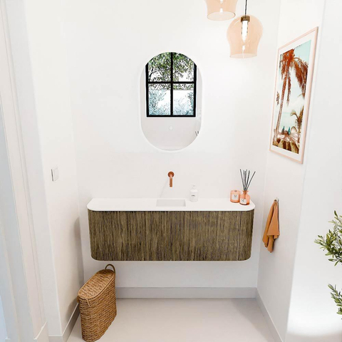 Le meuble dégage une pure élégance grâce à la façade en chêne massif avec des rainures verticales. Cette texture unique donne à l'ensemble une apparence raffinée qui attire immédiatement le regard. Les coins arrondis des deux côtés offrent une forme douce et organique qui complète le design. La combinaison de la couleur profonde Dusk et du Talc clair de la vasque crée un contraste harmonieux qui donne à votre salle de bains un aspect moderne et chaleureux à la fois. Ce meuble n'est donc pas seulement un élément fonctionnel, mais aussi un véritable point fort qui élève votre intérieur à un niveau supérieur.